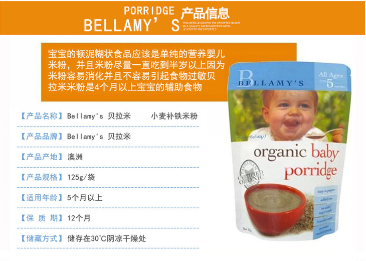 澳大利亚贝拉米Bellamy's燕麦米粉5+段125g