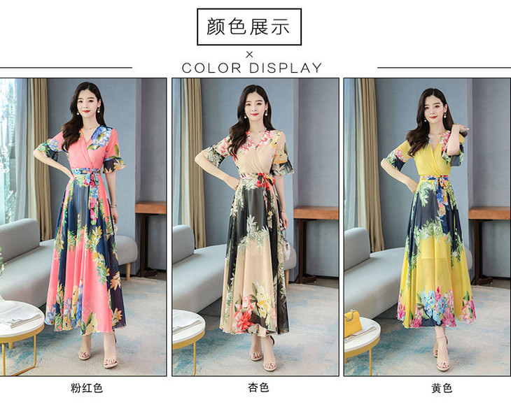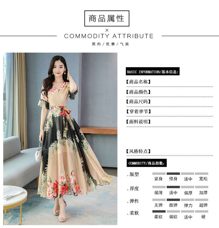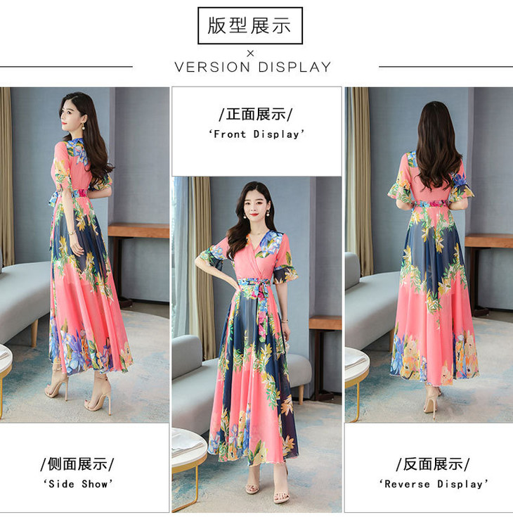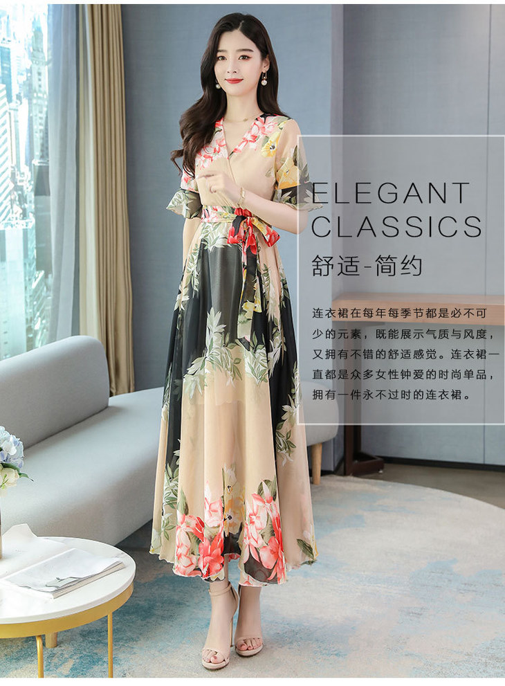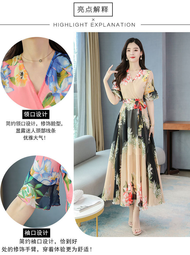 XFFS9032新款时尚气质收腰显瘦V领印花过膝连衣裙