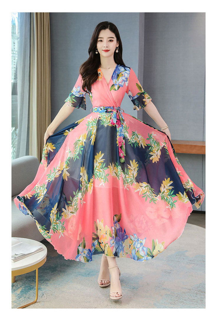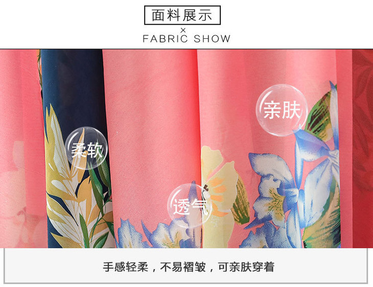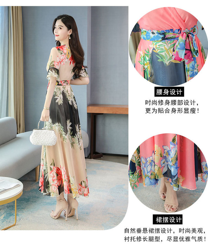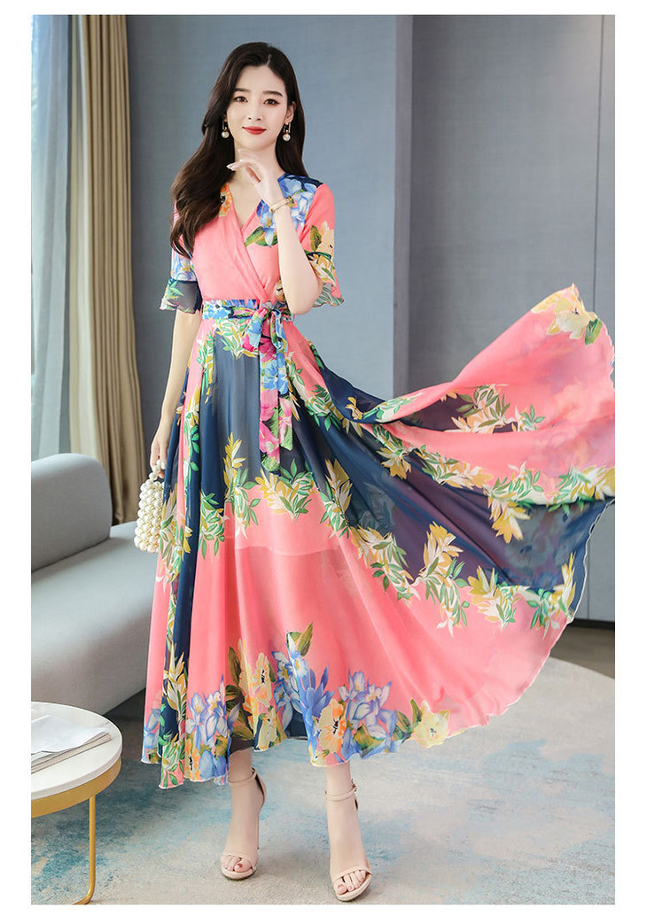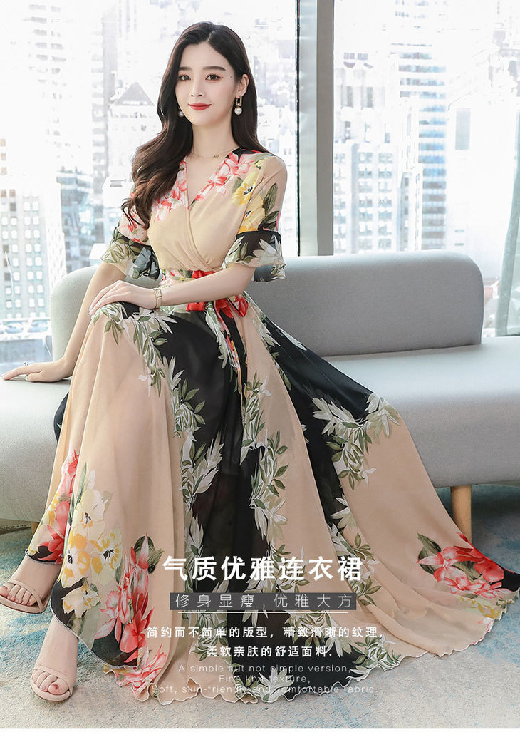 XFFS9032新款时尚气质收腰显瘦V领印花过膝连衣裙