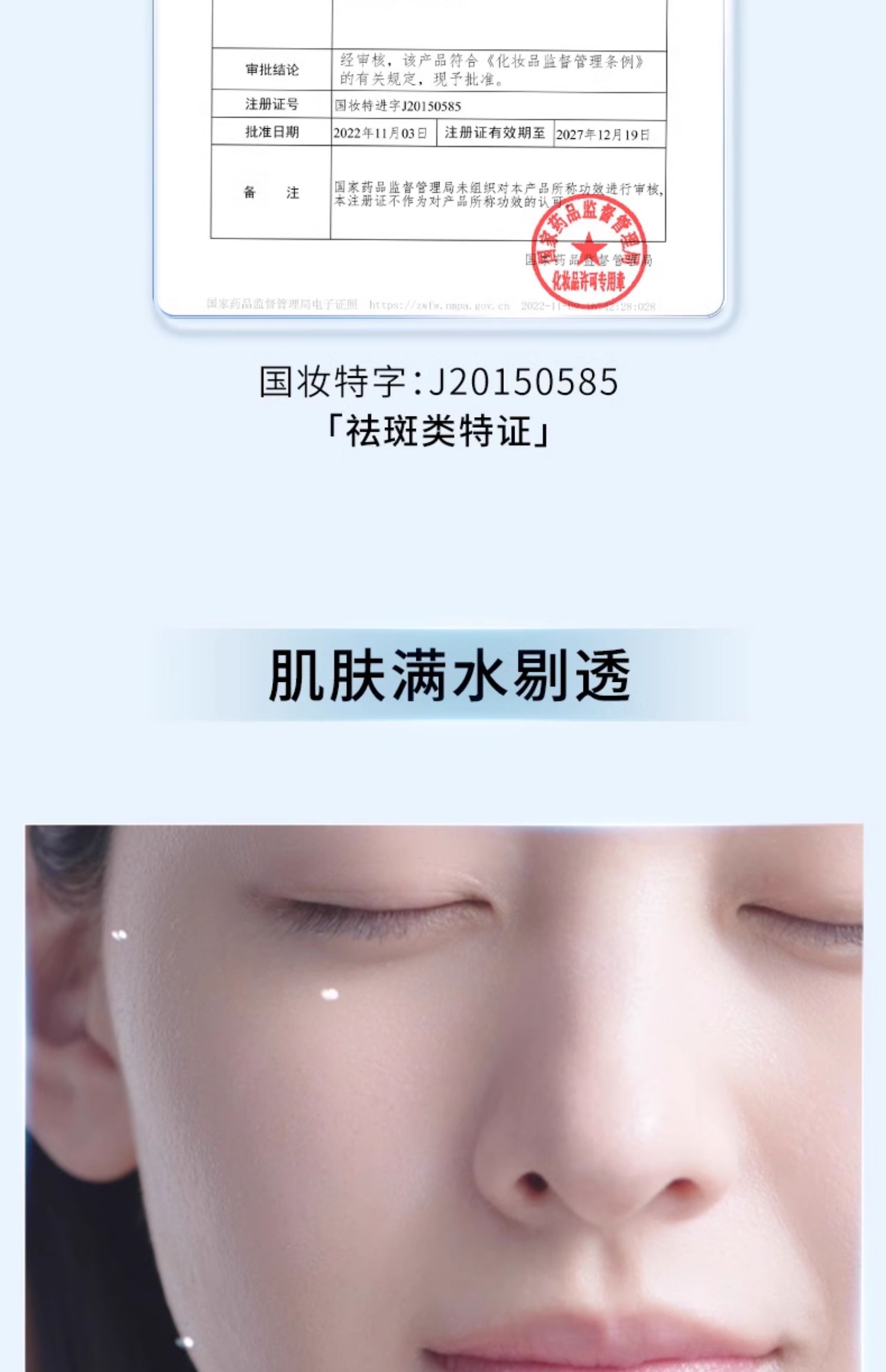 国家药监局提示您:宣称用于祛斑美白、防晒、染发、烫发等的化妆品为特殊用途化妆品,产品标签上应标注‘国妆特字’或者‘国妆特进字’的批准文号。