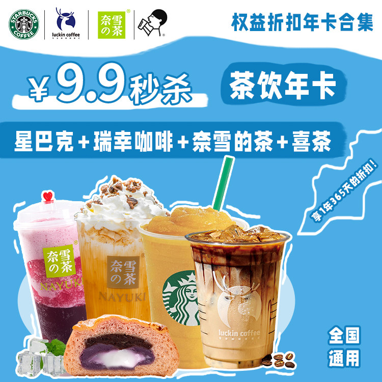 【全国门店通用】¥9.9=星巴克+瑞幸+奈雪的茶+喜茶折扣权益年卡!一卡在手,喝足一年优惠!