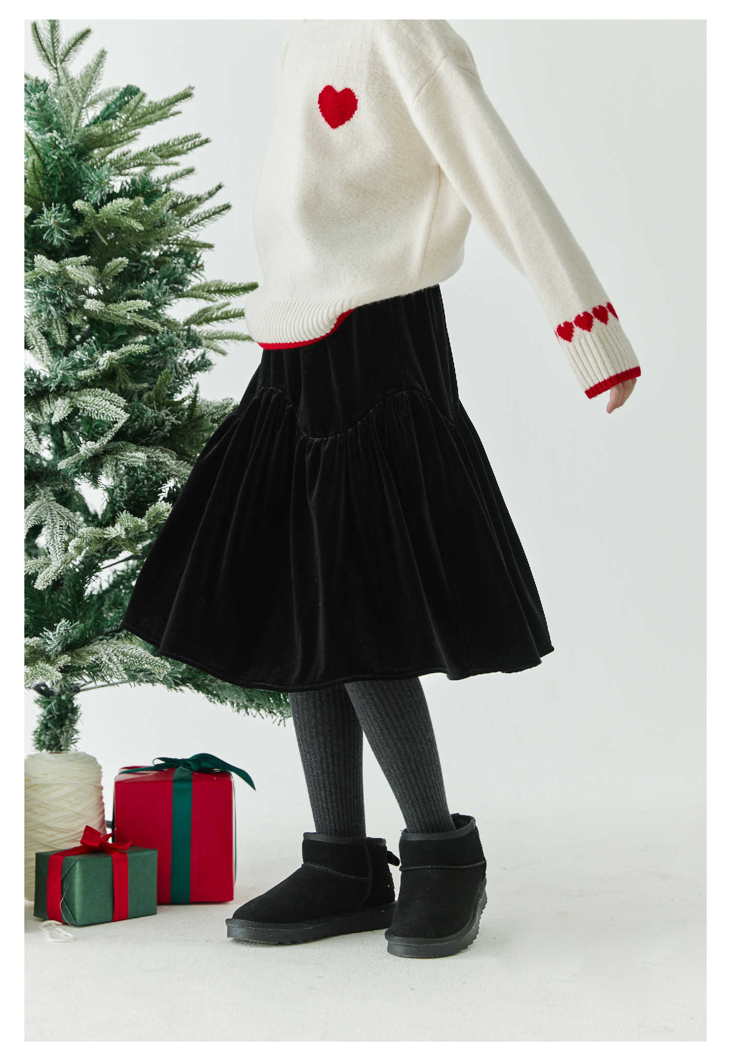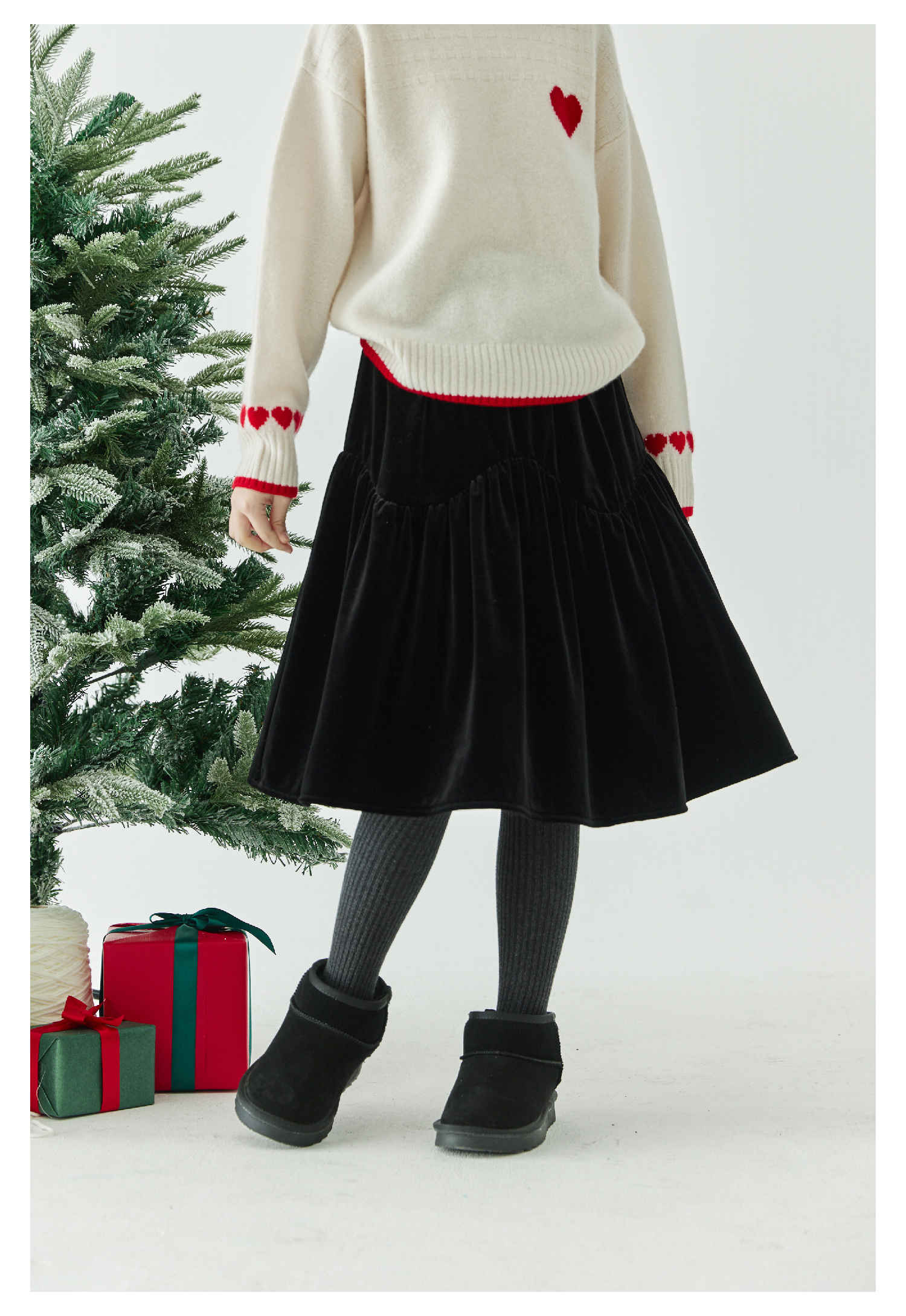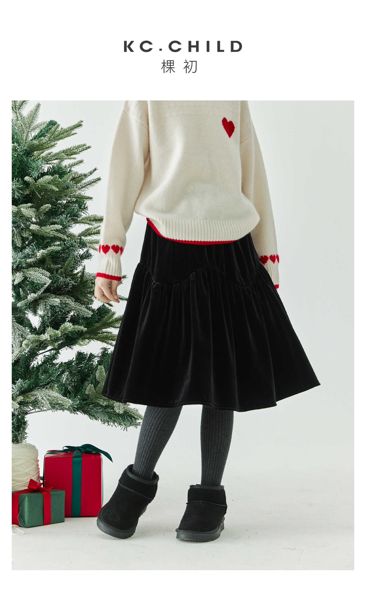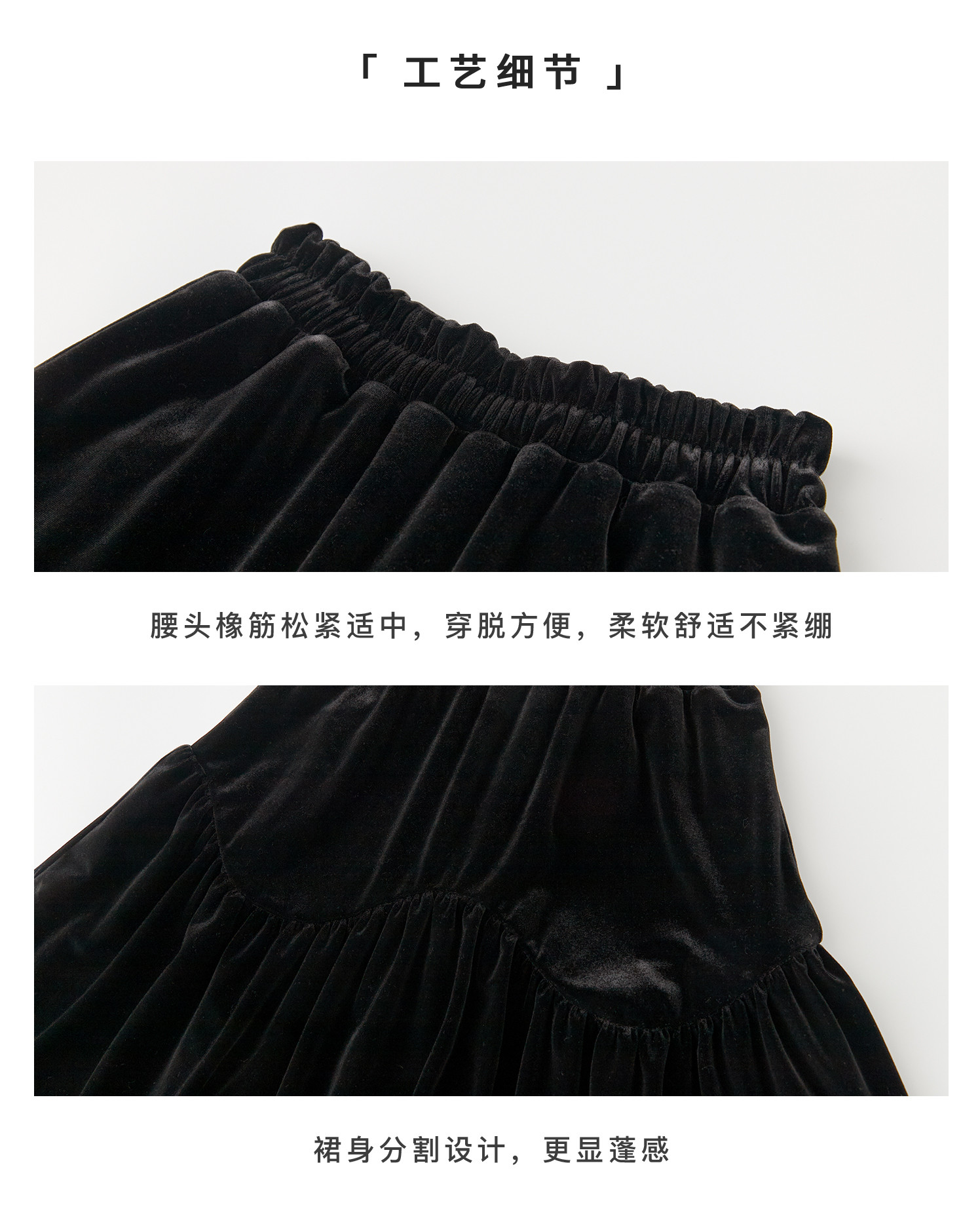 棵初2024年冬季新款女童丝绒半裙黑色复古简约不规则压褶半身裙