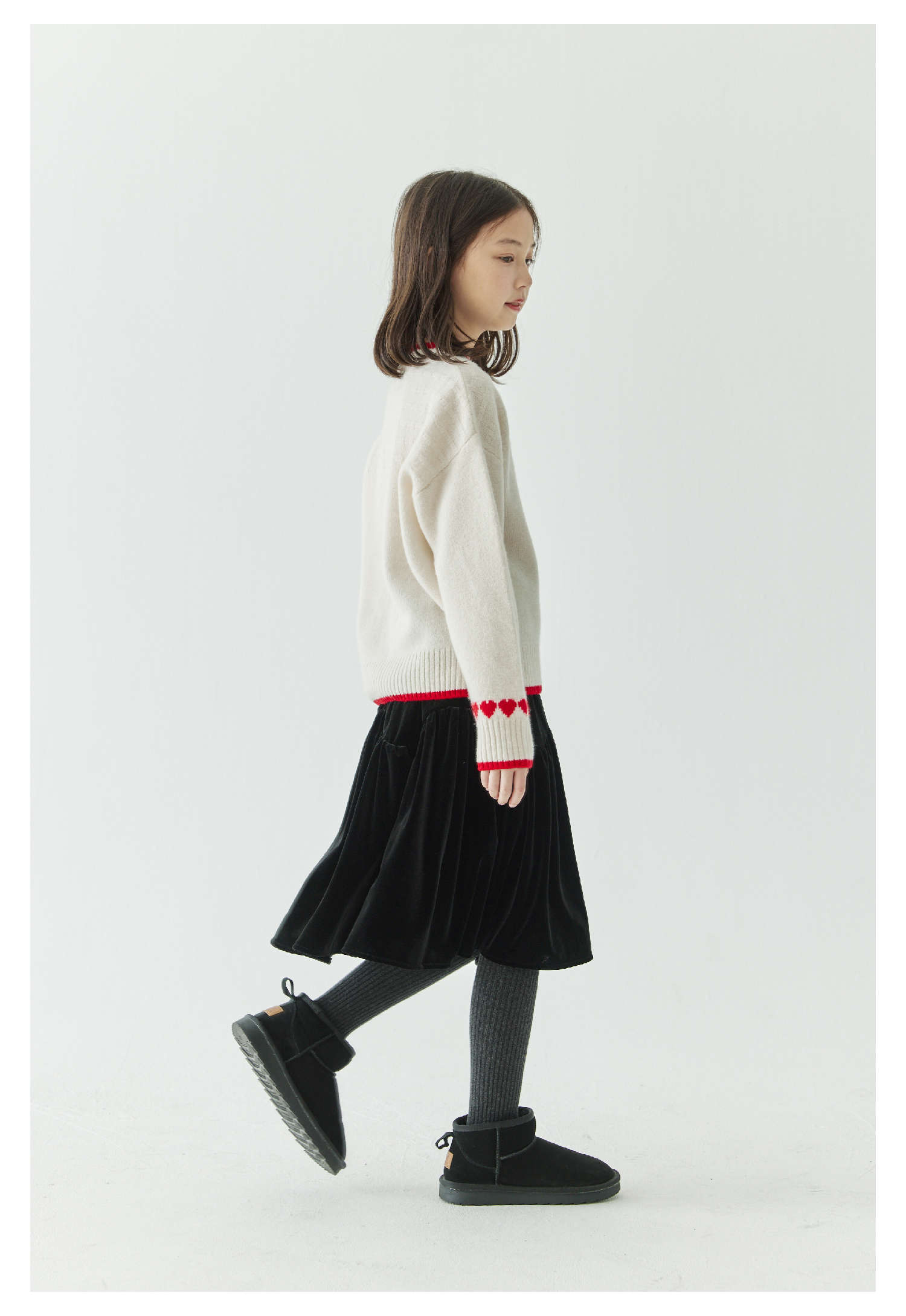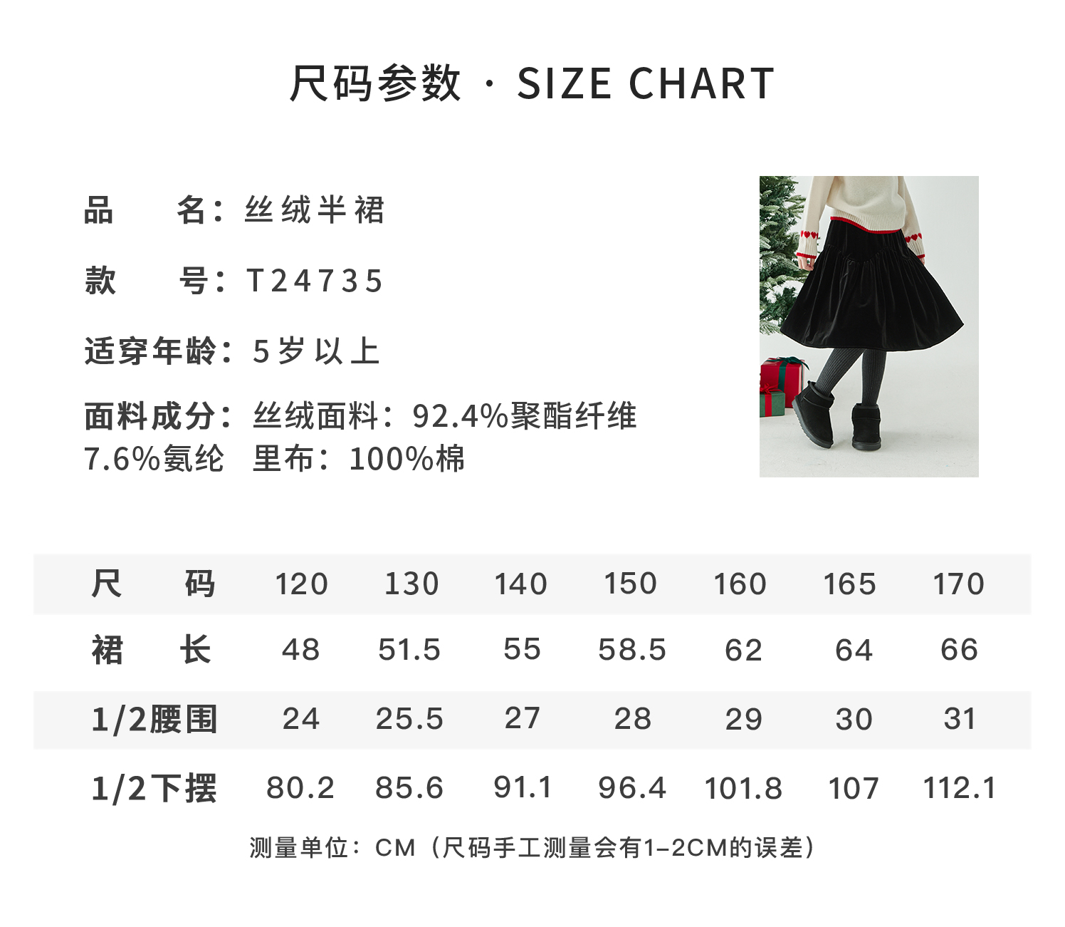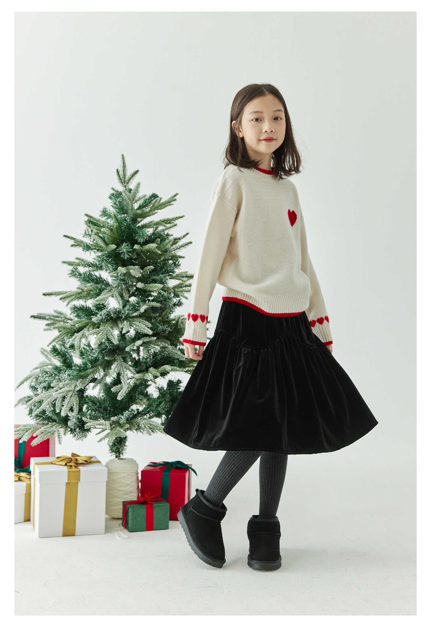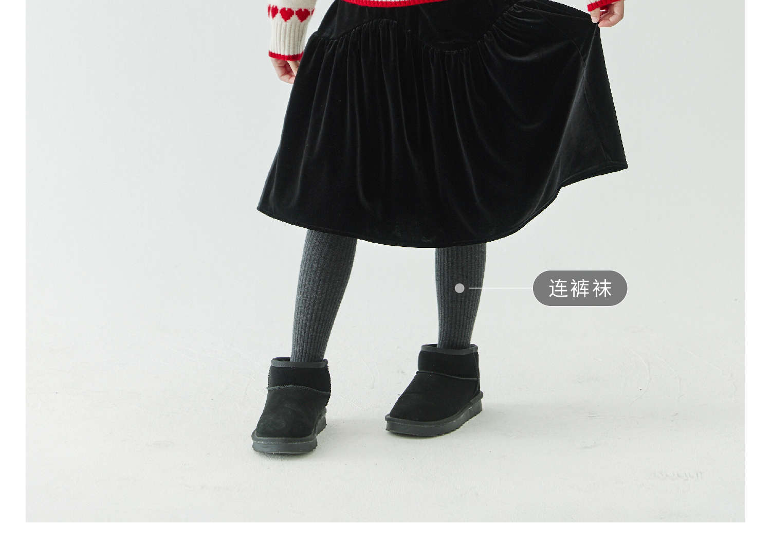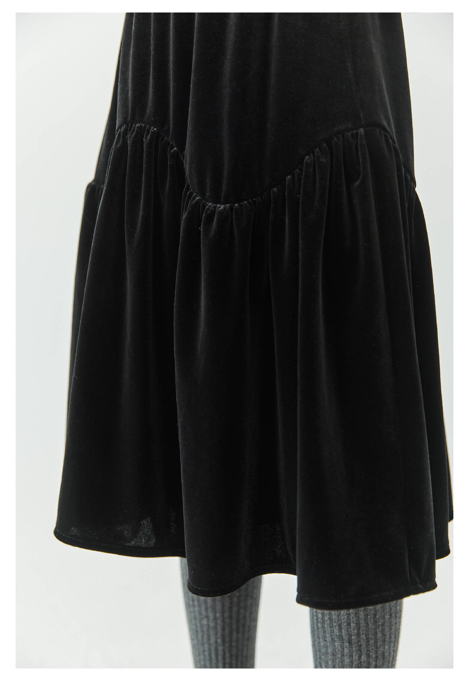 棵初2024年冬季新款女童丝绒半裙黑色复古简约不规则压褶半身裙