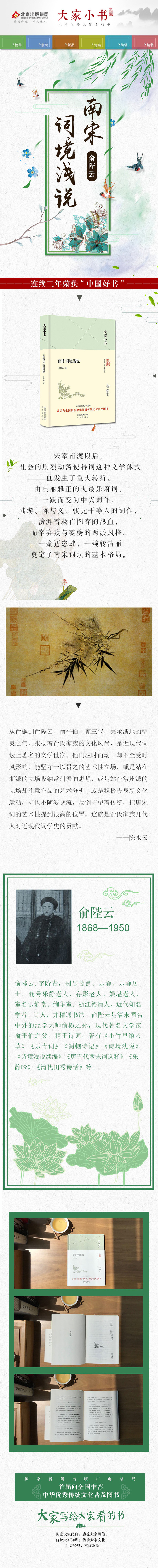 《唐五代两宋词选释》是俞陛云编撰的著名唐宋词选本,曾以《唐词选释》 《五代词选释》 《南唐二主词辑述》 与 《宋词选释》为题陆续发表;这次前三种以《唐五代词境浅说》为名,第四种拆分为 《北宋词境浅说》 与《南宋词境浅说》,分别收入 “大家小书”。这个选释,或者两种词境浅说,共收唐词二十三家,六十首;五代词二十五家,一百八十三首;宋词七十二家,六百六十六首。合计词人一百二十家,词九百零九首,非常丰富。