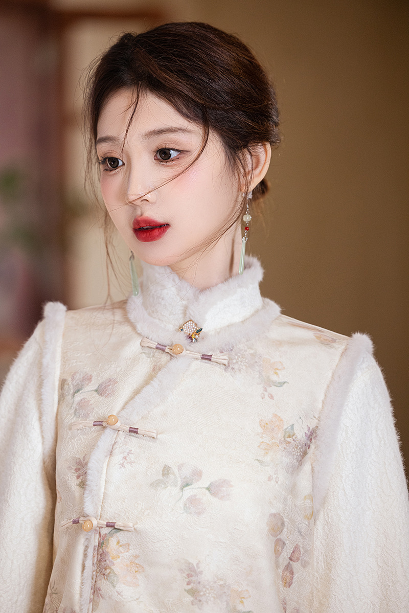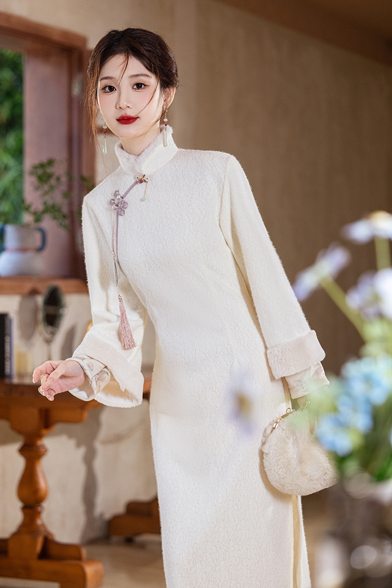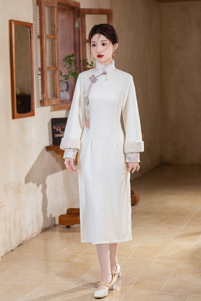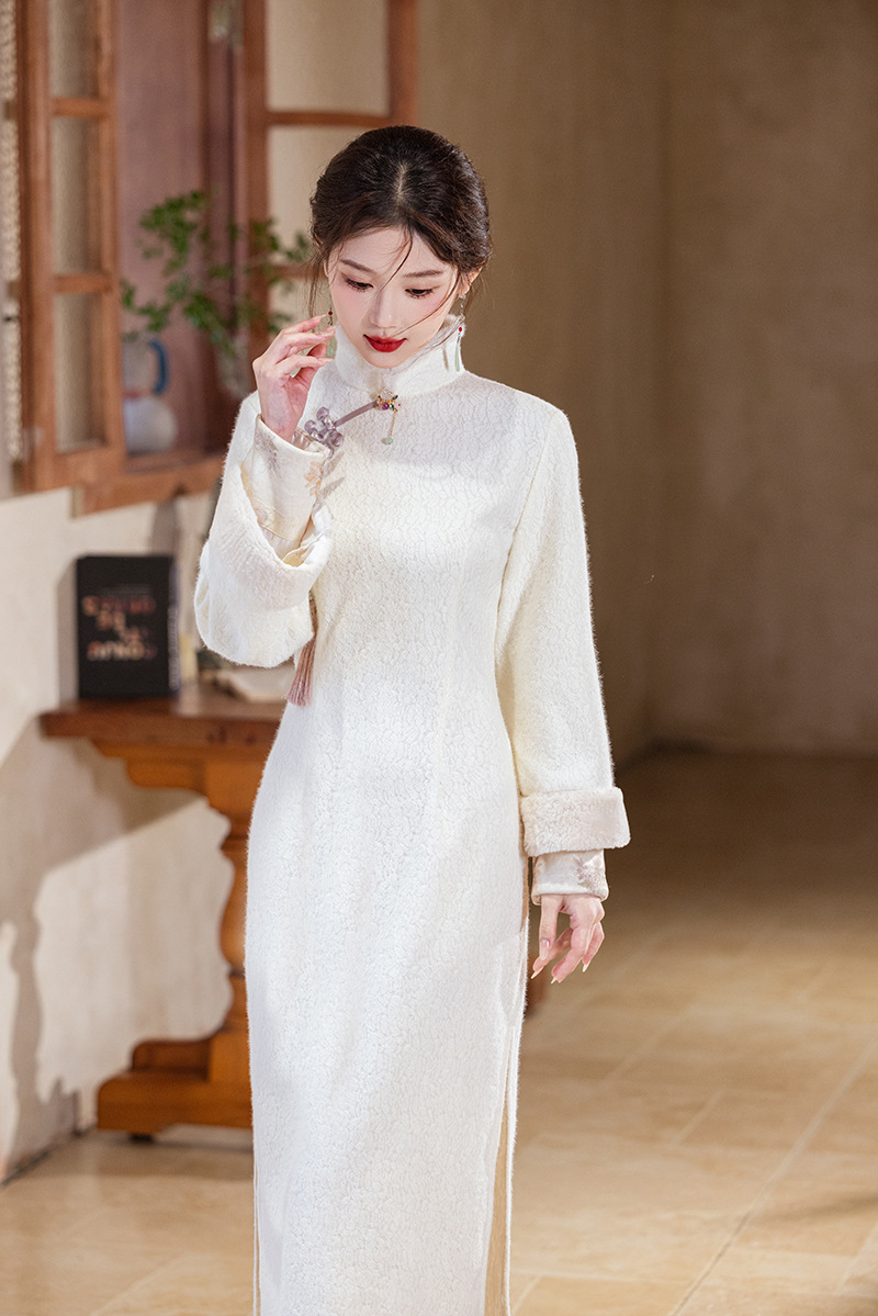 改良年轻款少女,加绒新中式白色旗袍YT-2879