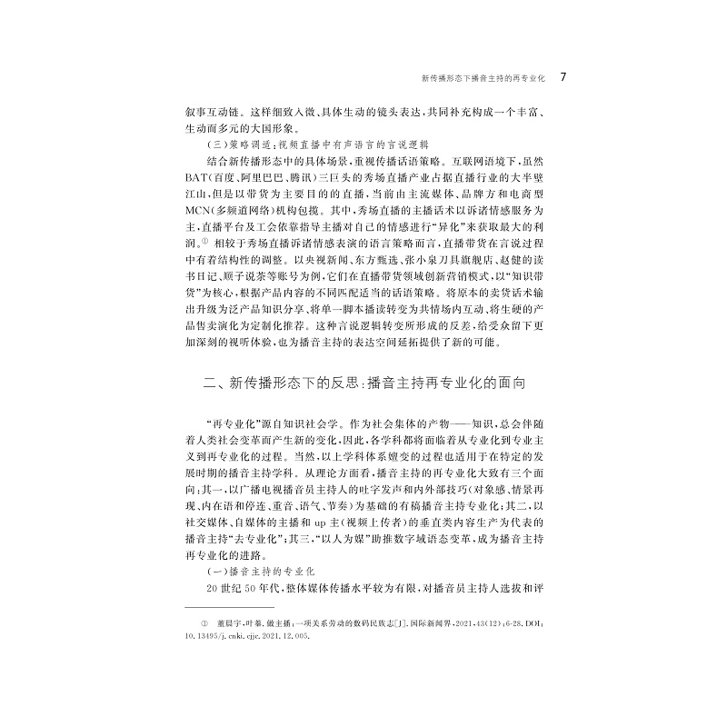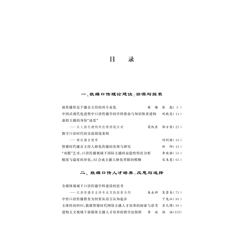 全媒体时代,舆论生态、媒体格局、传播方式发生深刻变化,口语传播面临新的想象。该书聚焦口语智慧,探索传统学科新的发展方向,既有学术权威的理论前沿,也有行业大咖的实战经验;既有来自行业一线的最新成果,也有后起之秀、莘莘学子们的探索。该书选录论文35篇,内容涉及口语传播的模式、渠道,平台运营的观念、思路,相关理论的演变、梳理,传统媒体的业务转型和拓展等,力求从最新的角度、最全的维度对新媒体视域下口语传播进行思考,为我国口语传播研究领域理论填补空白,并在实操应用和教学实践方面的尝试进行总结。