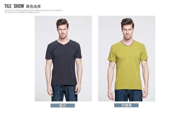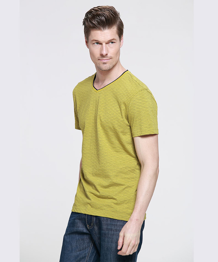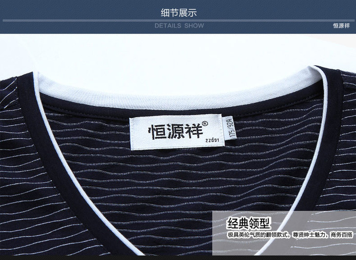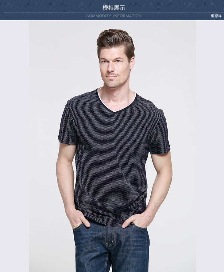 恒源祥男士夏季新款简约水波条纹V领短袖T恤 01153029