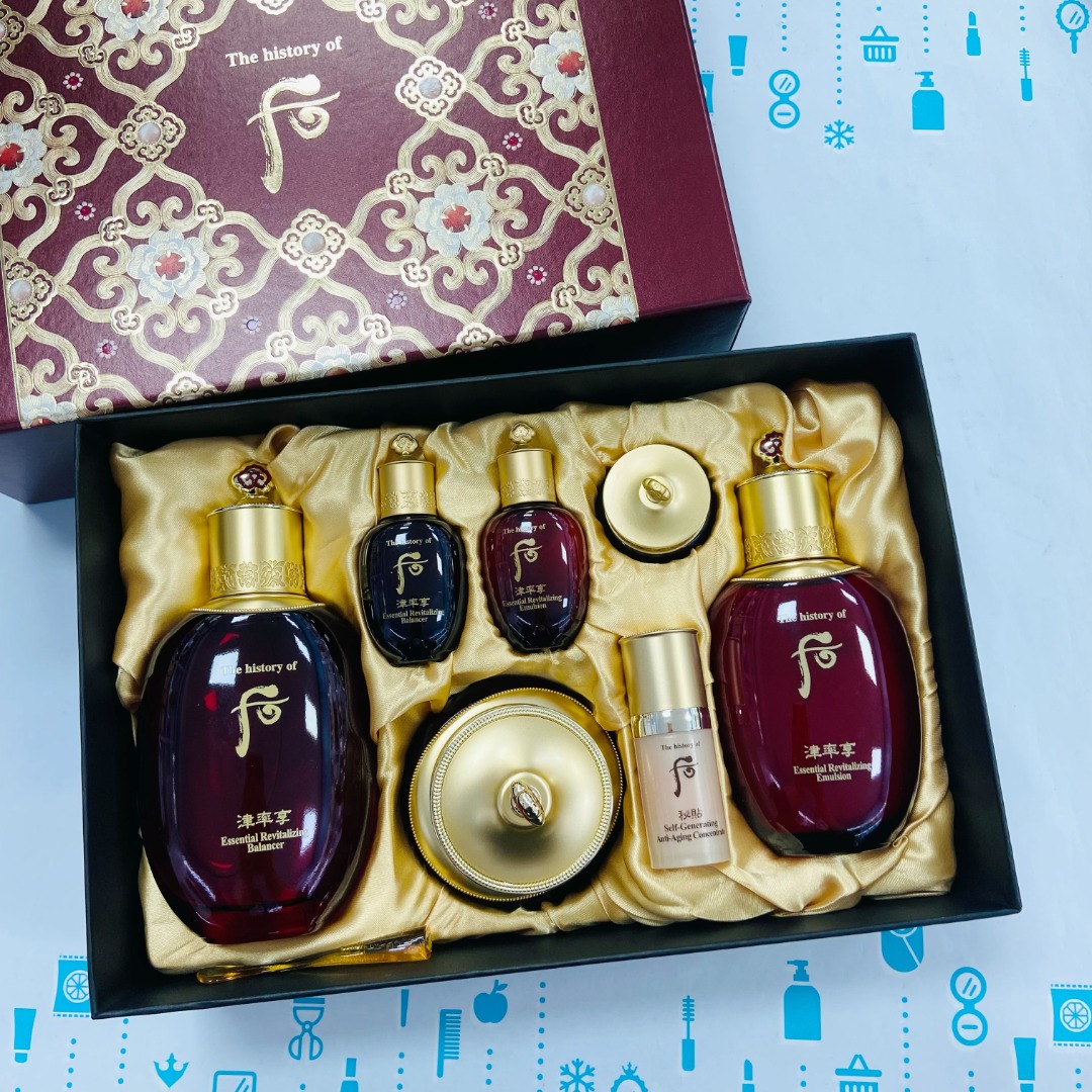👑WHOO津率享七件套 👍抗皱首选! ✅有效:保湿补水、滋养肌肤、紧致、抗皱抗衰老、祛黄提亮肤色 🙌因气血失调导致皮肤的粗糙晦暗,松弛无光的肌肤,使其恢复紧致水润、嫩白好状态 💯上脸滋润不油腻,清爽不干燥 💋适合30+以上的干性肌肤使用 【套盒包括】:水150ml+乳110ml+水乳20ml*2+面霜30ml+眼霜5ml+秘贴精华8ml