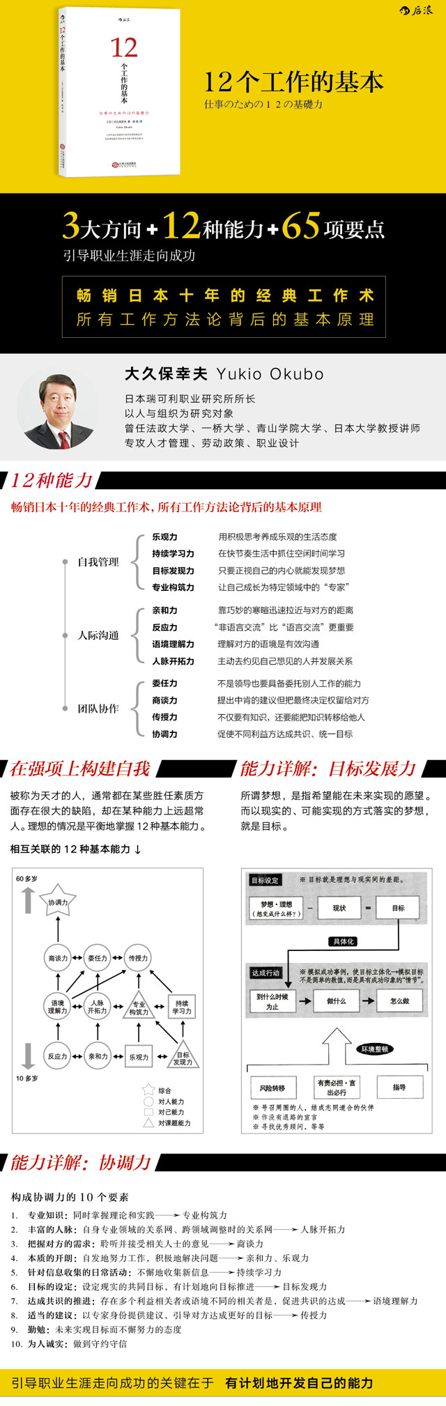 在本书中,职业研究专家大久保幸夫并不直接教人应对工作中的具体问题,而是从工作的本质出发,向读者传授一套适用于解决工作中所有问题的基本方法。具体来说,就是帮读者掌握反应力、乐观力、目标发现力、持续学习力、专业构筑力等12种工作需要的基本能力。作者认为,无论你初入职场还是工作多年,是否拥有高学历和光鲜的资格证书,只要学会这12种基本能力,就能在此基础上自如地演化出针对人际沟通、自我管理、团队协作等各种具体问题的工作方法论,进而从容不迫地应对职业生涯中可能遭遇的种种困境。