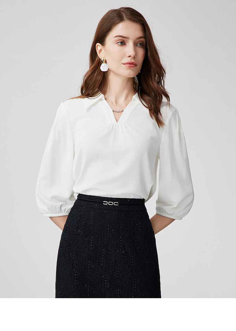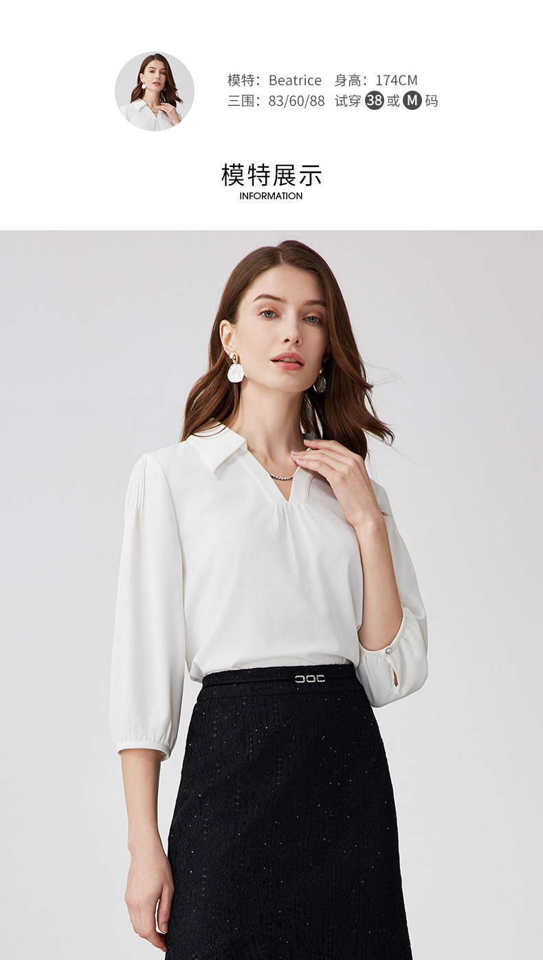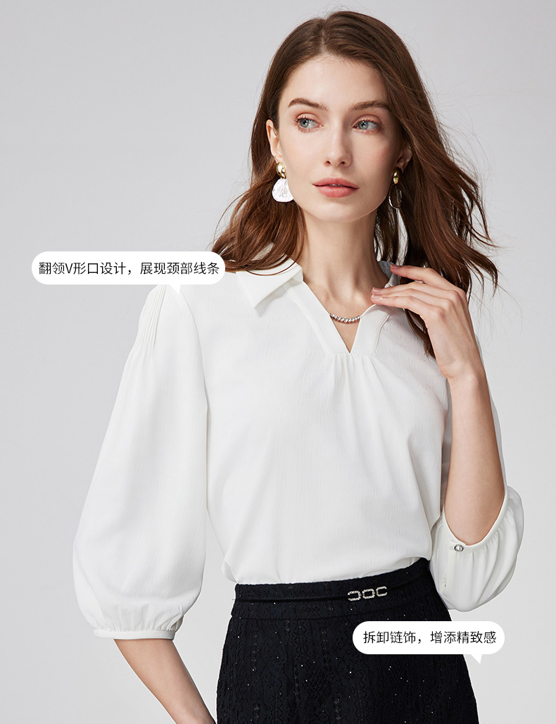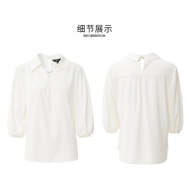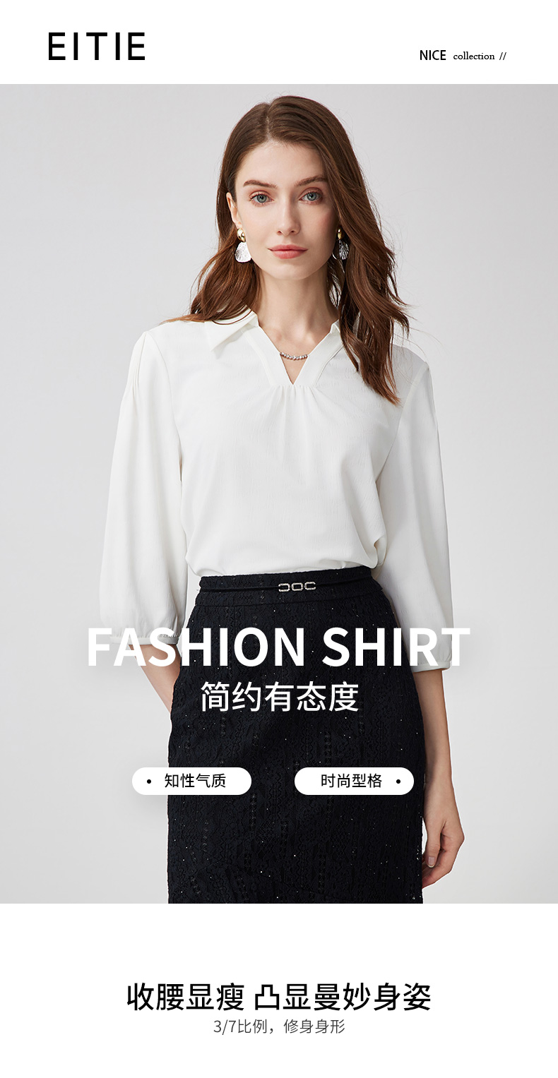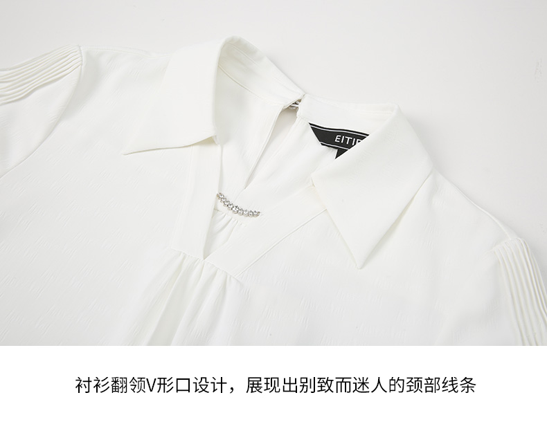 EITIE爱特爱时尚V领直筒宽松显瘦通勤白色灯笼袖衬衫上衣24春新款A2413307