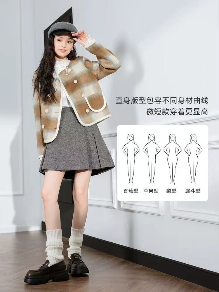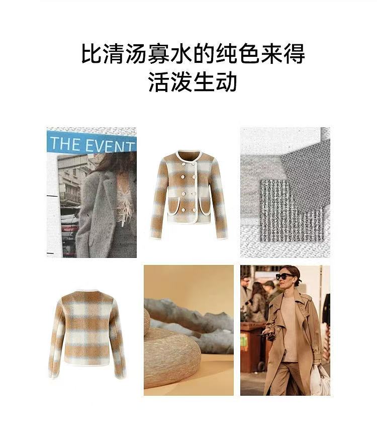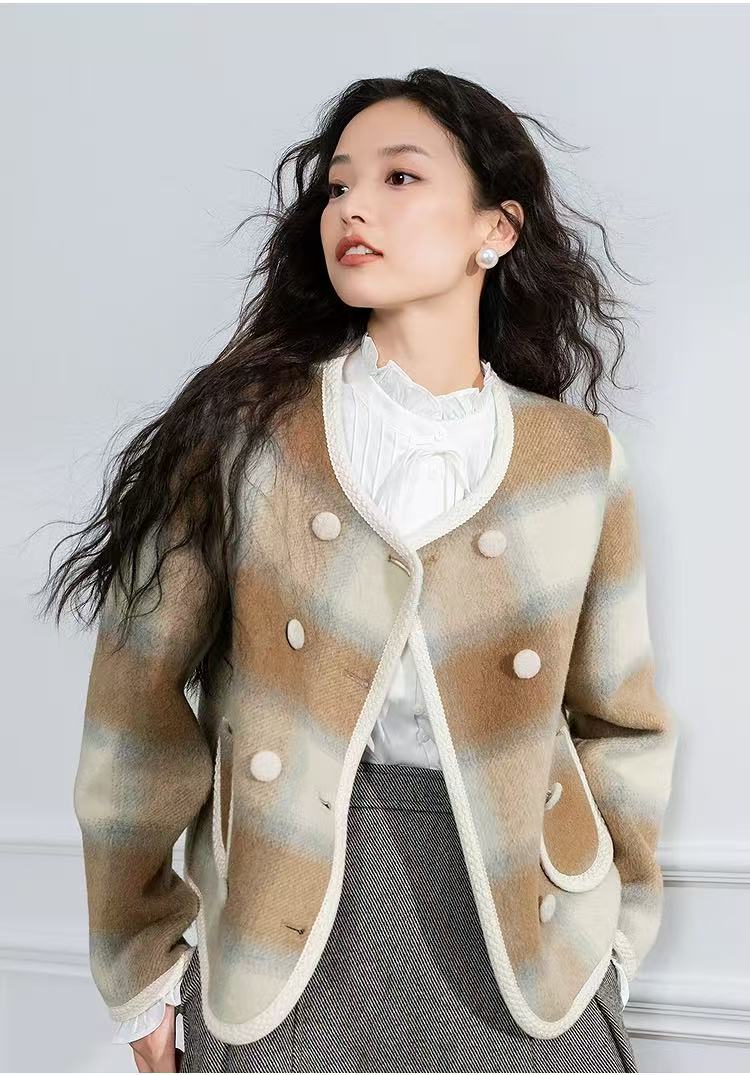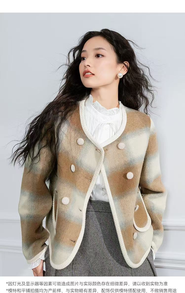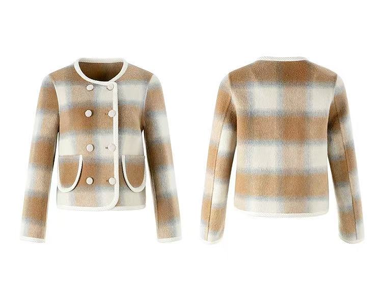 【高端系列】手工定制8292款羊毛➕桑蚕丝➕羊驼渐变叠影格纹短款双面尼大衣-喜出