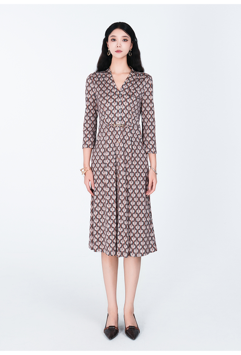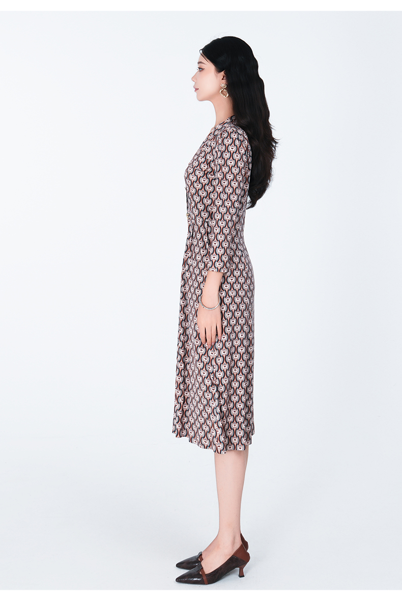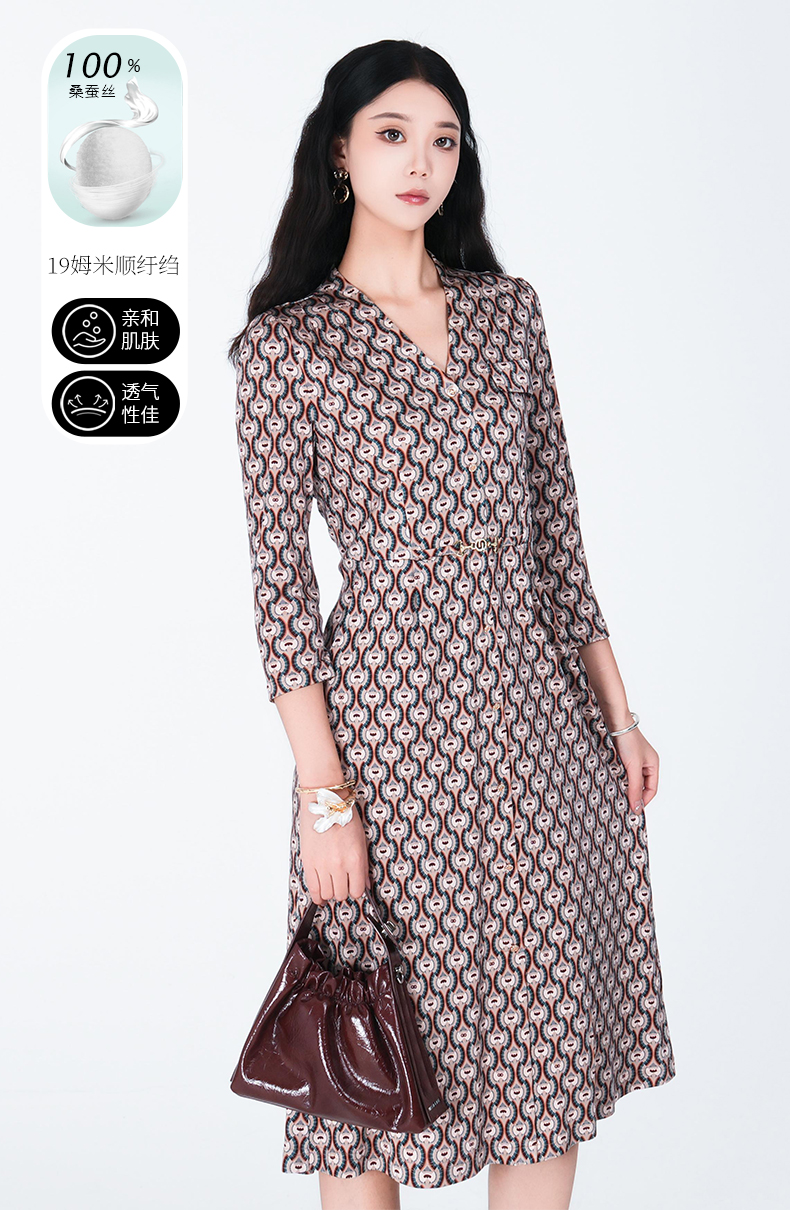 乔万尼马赛克咖啡印花100%真丝收腰显瘦连衣裙ED2E493