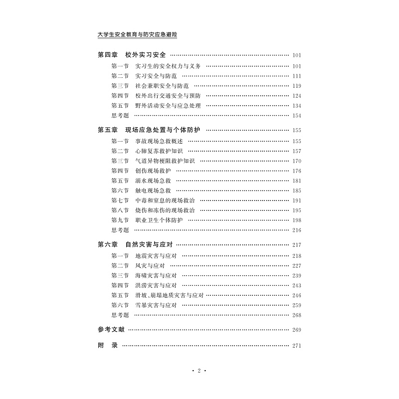 针对世界各国灾害事故频发和灾害严重危害公众健康的现状,为满足普通人群对临灾自救互救知识技能的需求,我们根据近几年来面向在校大学生开设大学生安全教育及防灾应急避险课程的教学经验,并结合目前我国常见的自然灾害和人为灾害类型编写本书。每一个学生都要有对自己负责、对企业负责、对社会负责的态度,居安思危,防灾避险,警惕各种灾害危险。