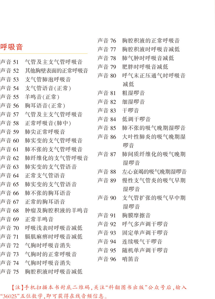 •配有在线音频,包括心音50个,呼吸音46个,可以让读者更好地分辨正常和异常的呼吸音及心音。