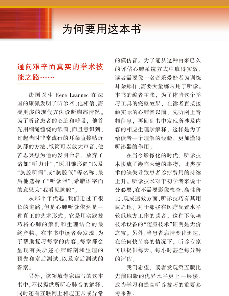 这本书将叙述与在线音频独特组合,为临床听诊技术的进一步发展提供了有益的学习工具。
