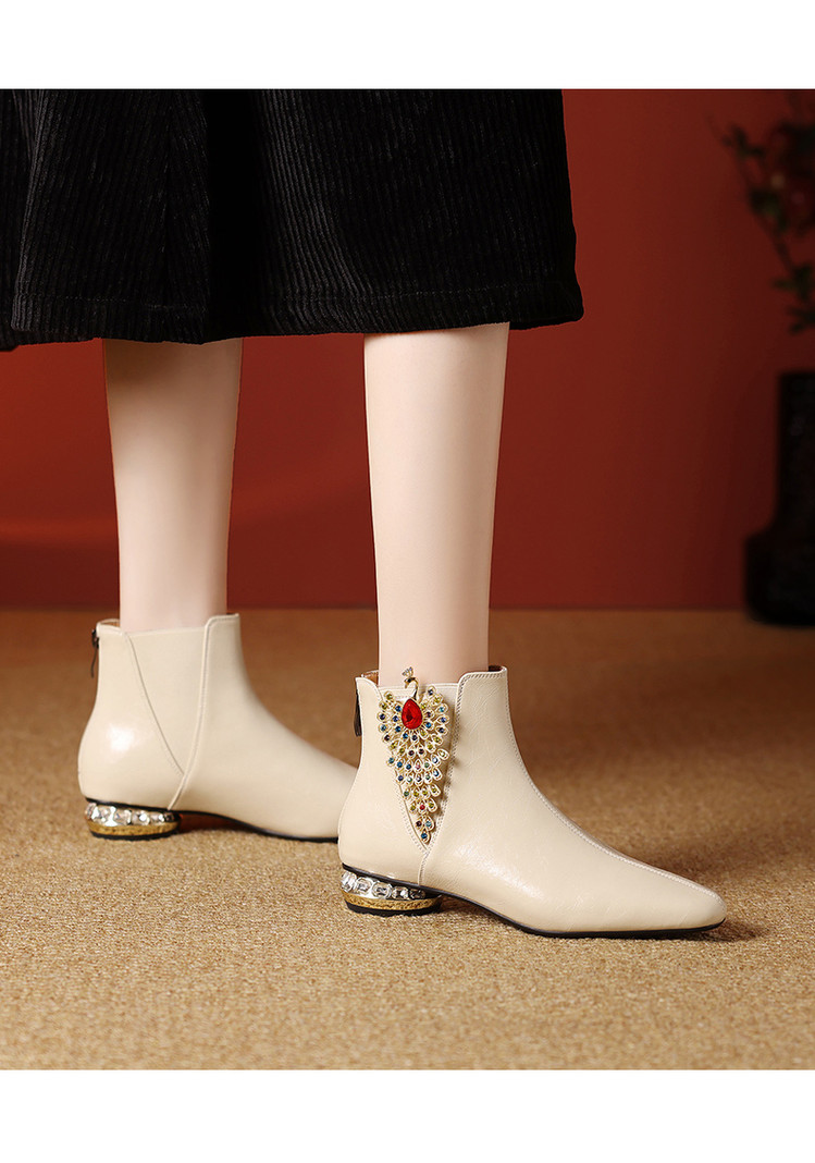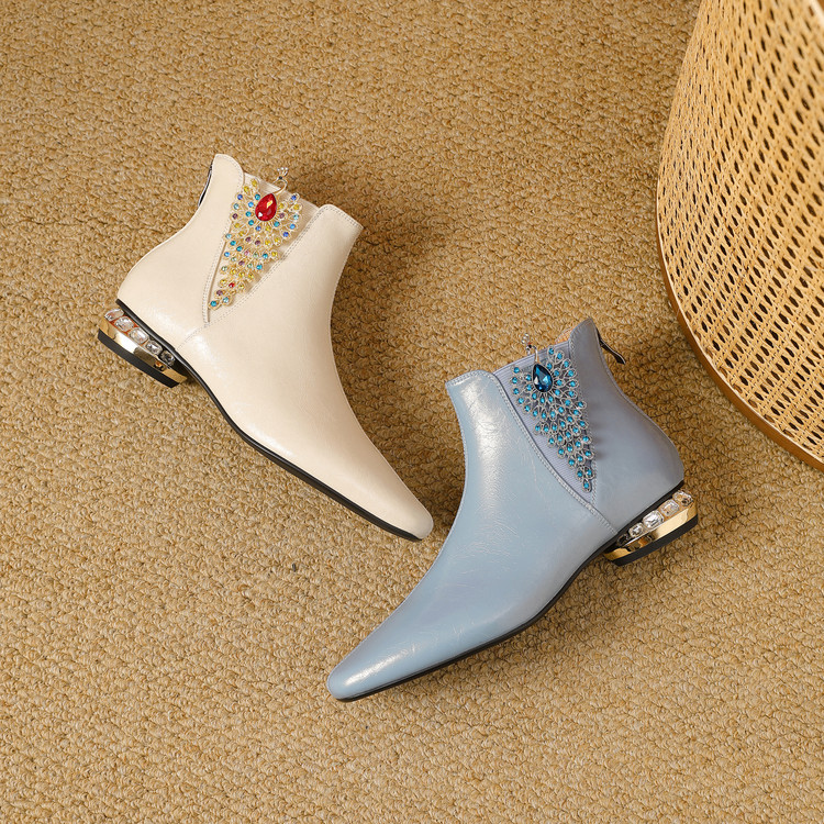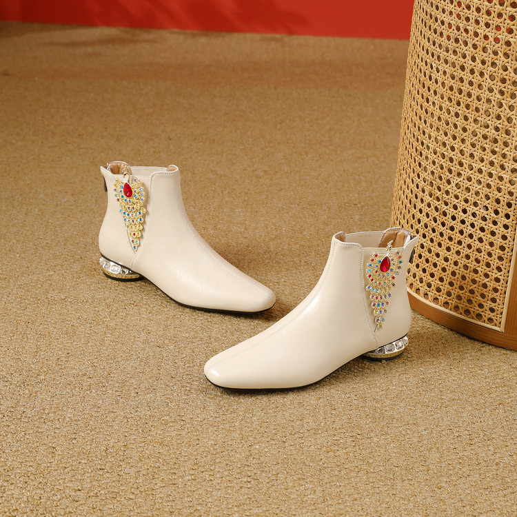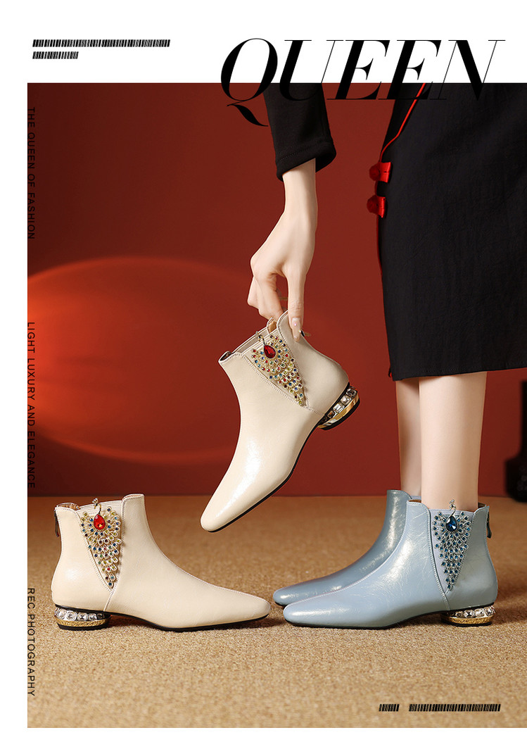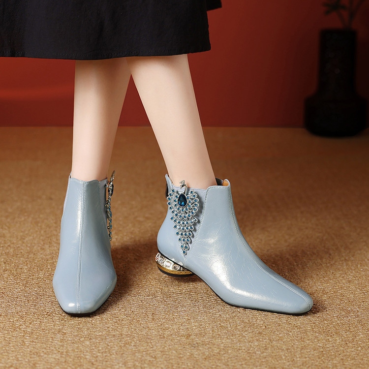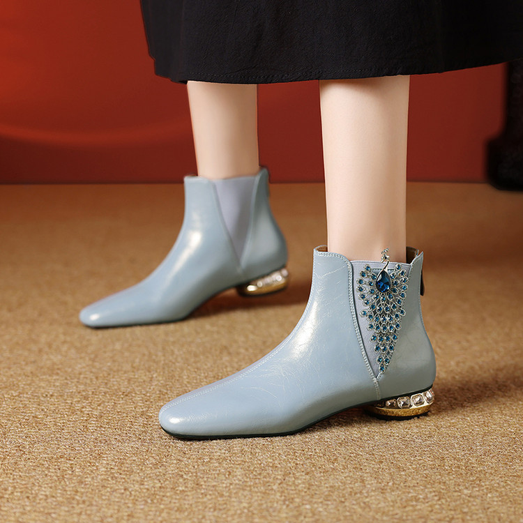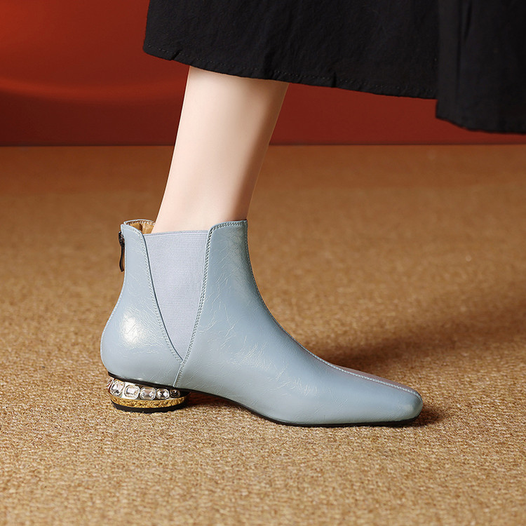 【预售5天】水钻低跟真皮显瘦小方头舒适短靴子女秋季新款短筒单绒里切尔西靴XC&8811