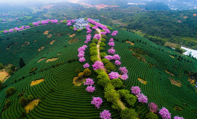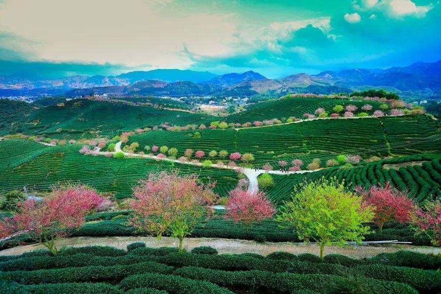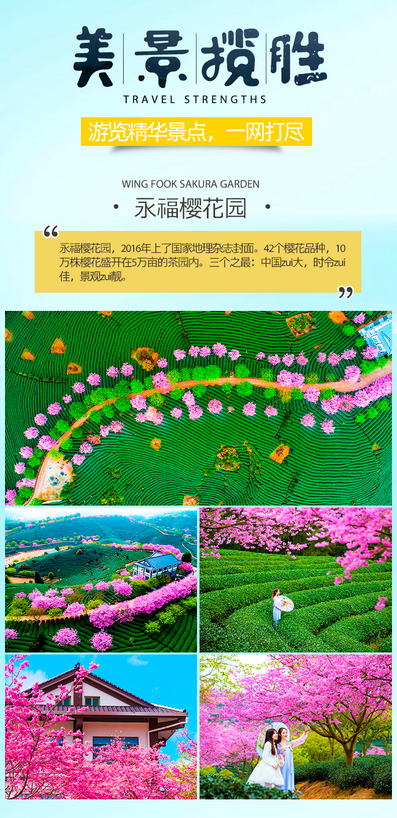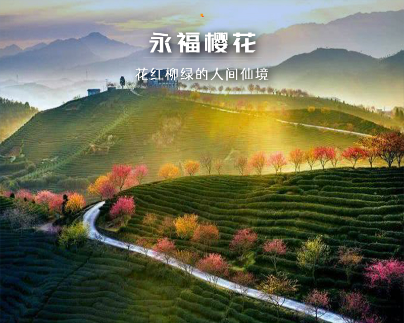 - 早餐后前往永福欣赏樱花。樱花品种主要有中国红、绯寒樱、云南樱、染井吉野樱、牡丹樱、福建山樱等,品种多达42个。花期大约在每年1月下旬到3月中旬,樱花节一个品种接着一个品种开。茶园、绿树、樱花、远山、云海、鸟儿……樱花浪漫,伴着千亩茶园的清香,樱花漫天飞舞,触手可及。我们前往位于后孟村的台品樱花茶园拍摄,如今在网络上风传的永福樱花的图片,大多是在台品樱花茶园取景的,而且这里还曾经上过《中国国家地理》杂志的封面,可谓是闻名遐迩。随着名气越来越大,台品樱花茶园的樱花数量也在逐年增加,景观线也越来越丰富,景色越来越美。