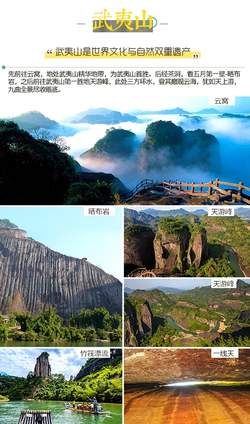 2、门票:武夷山门票140元/人,景区观光车费70元/人;鼓浪屿渡轮30元/人,登岛不要门票,景点通票100元/人; 土楼田螺坑旅游景区门票100元/人;云水谣门票90元/人;永福樱花园50元/人;以上门票价格仅供参考,以景区实际公示为准,打折证件有效,如有请携带;