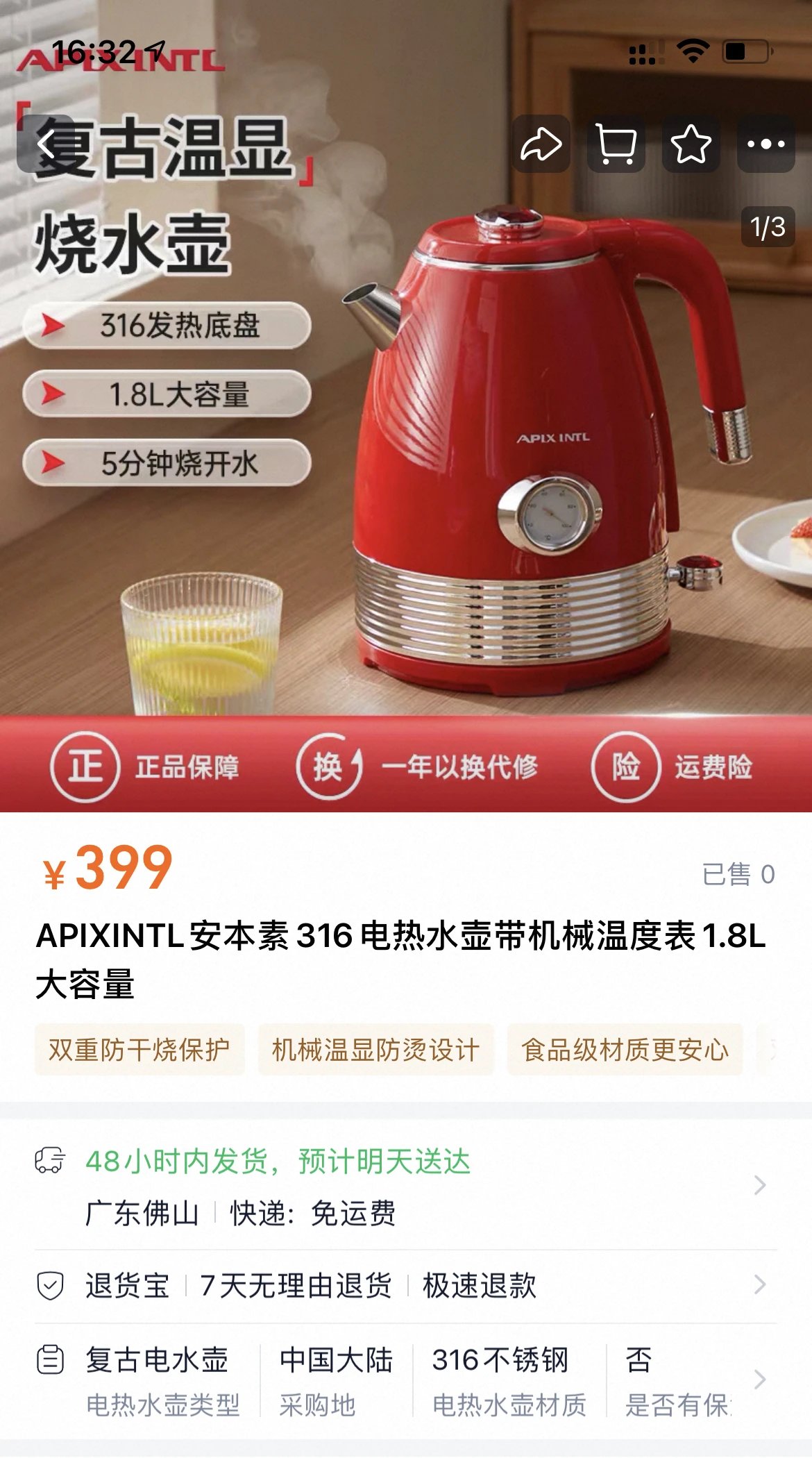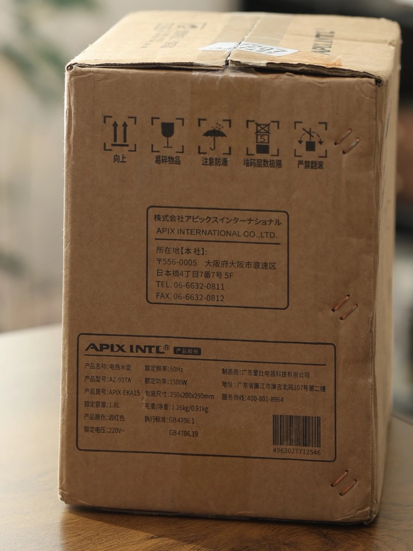 日本线下商超在售 直降300 【日本 APIXINTL安本素-复古烧水壶1.8L大容量】 官方售价399 荣获日本工业设计大赏+德国红点设计奖 机械温显表轻奢复古、实时观看壶内温度 食品级加厚304不锈钢内胆、不易藏水垢 一年质保!一年内质量问题免费换新 【品名】APIXINTL安本素复古烧水壶1.8L 【规格】酒红色 【货号】APIX-EKA15 【型号】AZ-907A 【额定容量】1.8L 【材质】PP+304不锈钢+316不锈钢 【毛重/净重】1.26KG/ 0.91KG 【产品尺寸】210*170*245mm 【包装尺寸】250*200*290mm 【产地】广东佛山 【发货地点】广东佛山/中山 【发货物流】申通、韵达、圆通 中通邮政等 【发货时效】48小时 【不发货地区】新疆、西藏不发货 【加运费地区】青海、内蒙古、甘肃、宁夏+20 【售后标准】一年质保 1.支持7天无理由退换; 2.从签收日起一年内,非人为的质量问题以换代修;1个月内质量问题,品牌承担来回运费,超过1个月运费顾客自理;人为导致的主观毁坏/破损/商用等,不在保修范围内;