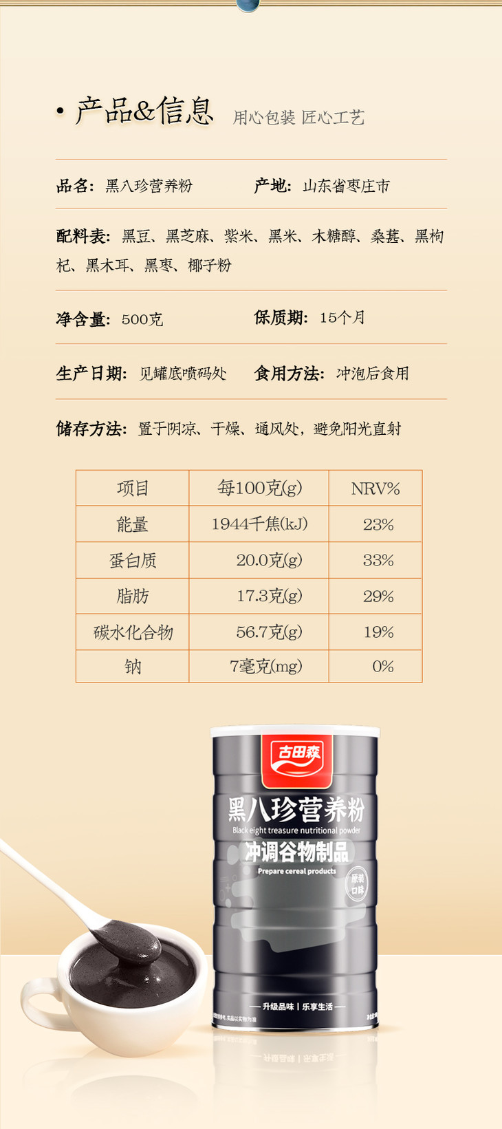 品名:黑八珍营养粉规格1:500克/罐*2 包装:纸箱 快递:韵达、中通、圆通、申通 保质期:15个月 售卖期:全年 产地:山东枣庄 发货时效:最晚72小时 运费模板:新疆、西藏、甘肃、内蒙、宁夏 、青海、海南、港澳台地区和海外周六周天、节假日除外,早上十点之前的订单是48小时发货 ,到货时间约为2-5天,请您耐心等待 |
