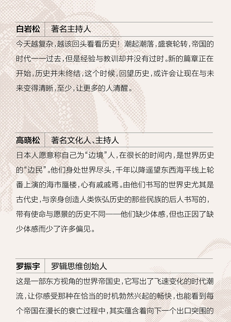 ★ 【一部有野心的世界史】过去的历史书大多是涵盖整个时代、分期清晰的作品,换句话说,是非常静止的历史。《兴亡的世界史》要讲出世界的动态历史,它以帝国为锚点,横向连接各个地区,构建出全球历史的四维图景。在此意义上,它是一部很新、很有野心的世界史。