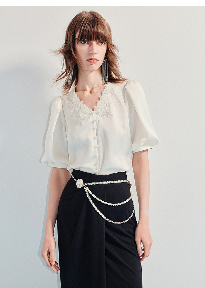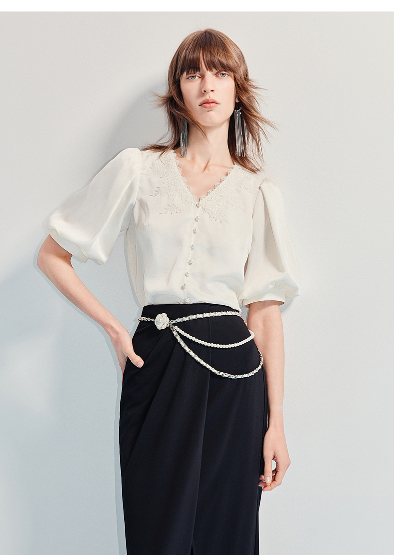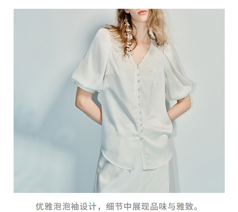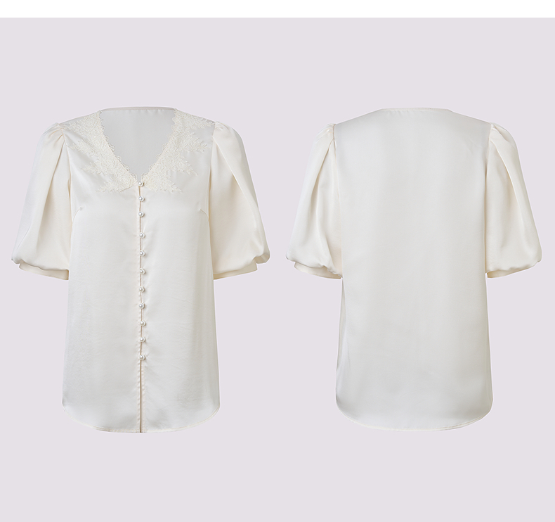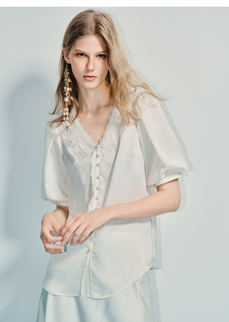 MAXRIENY精致宫廷风蕾丝雪纺衫25夏款绣花泡泡袖衬衫衬衣女上衣(货号:MF86TP016)