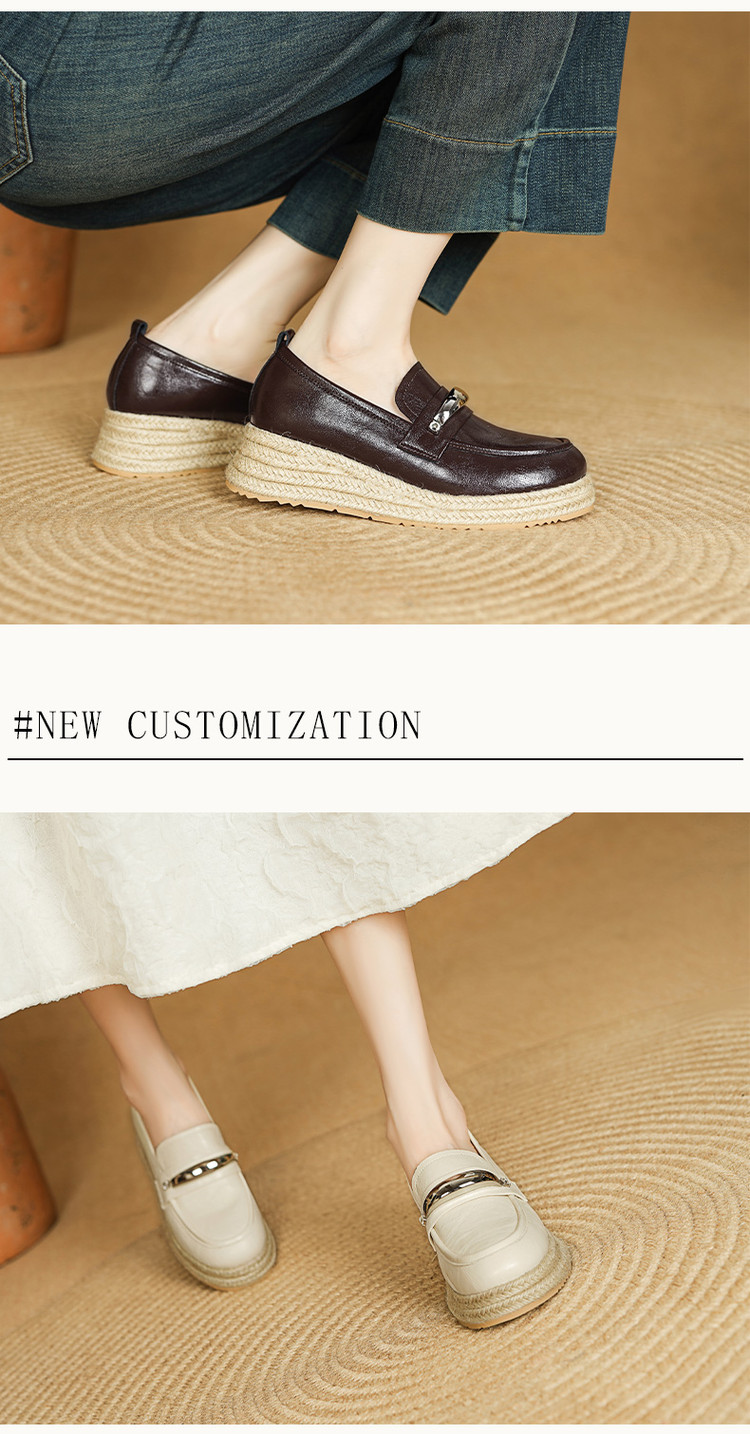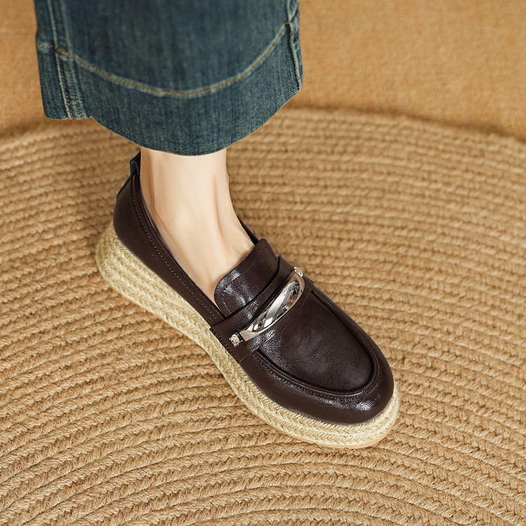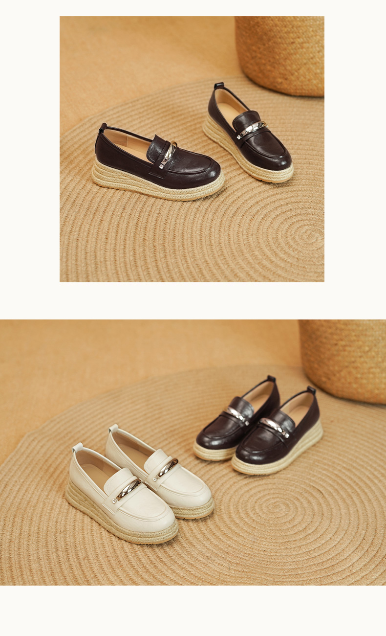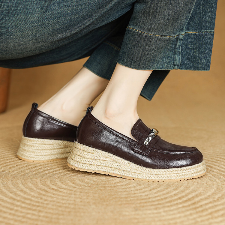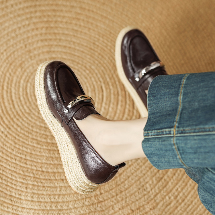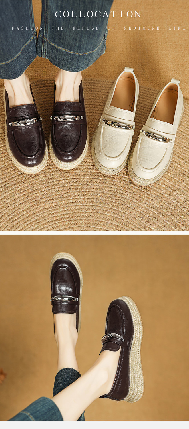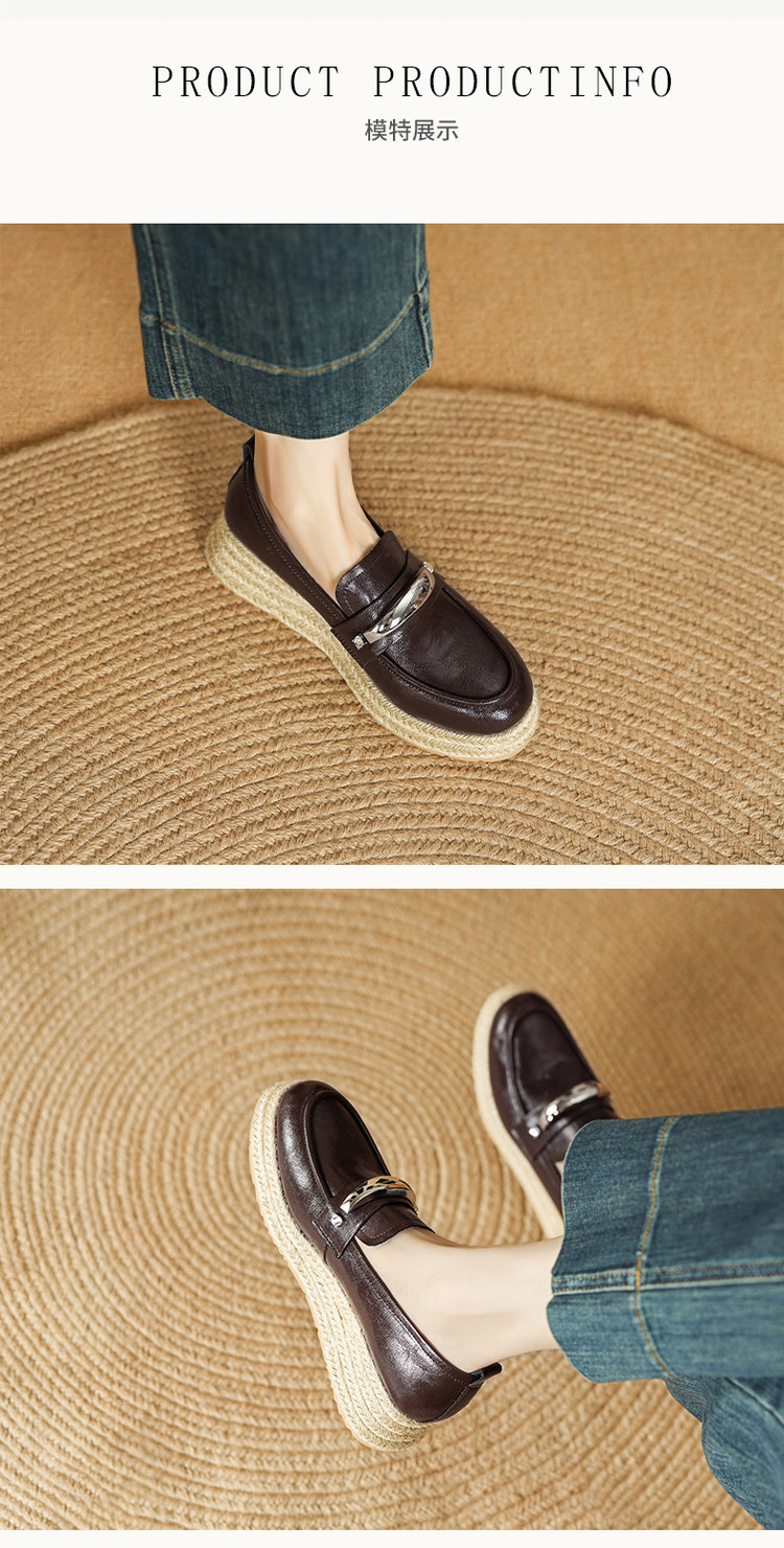 【预售5天】高颜值法式单鞋女深口春秋圆头中跟平底真皮坡跟棕色乐福鞋MLD&AM806