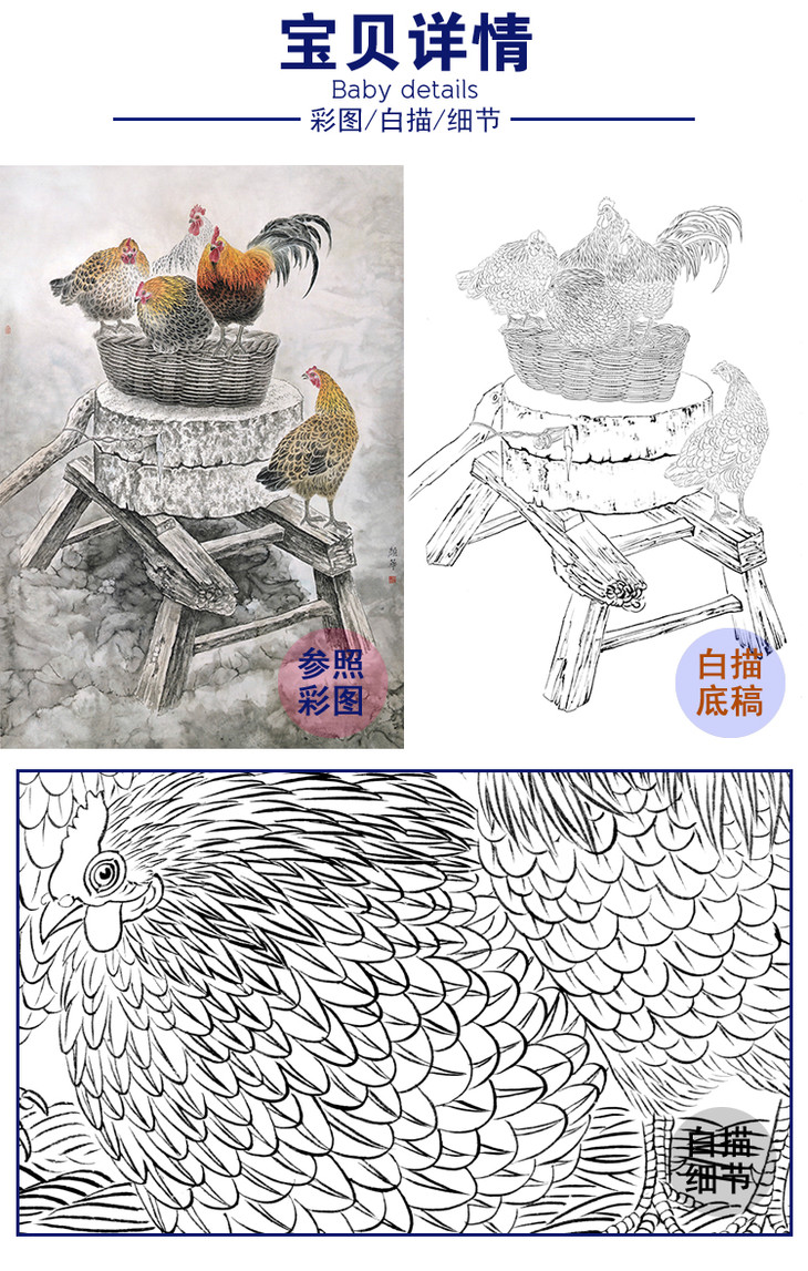 竖幅工笔动物白描底稿-公鸡-A527