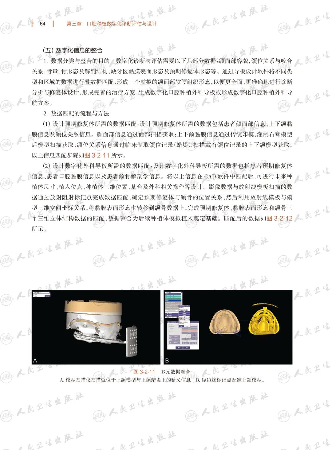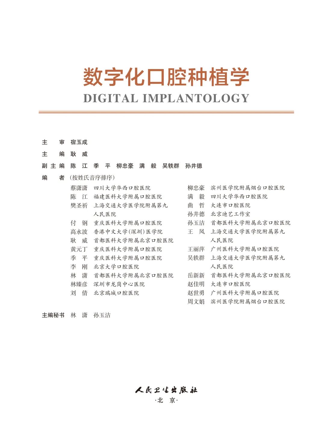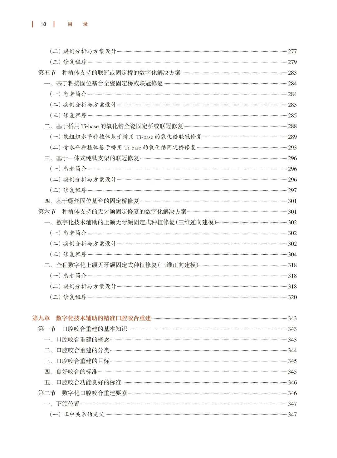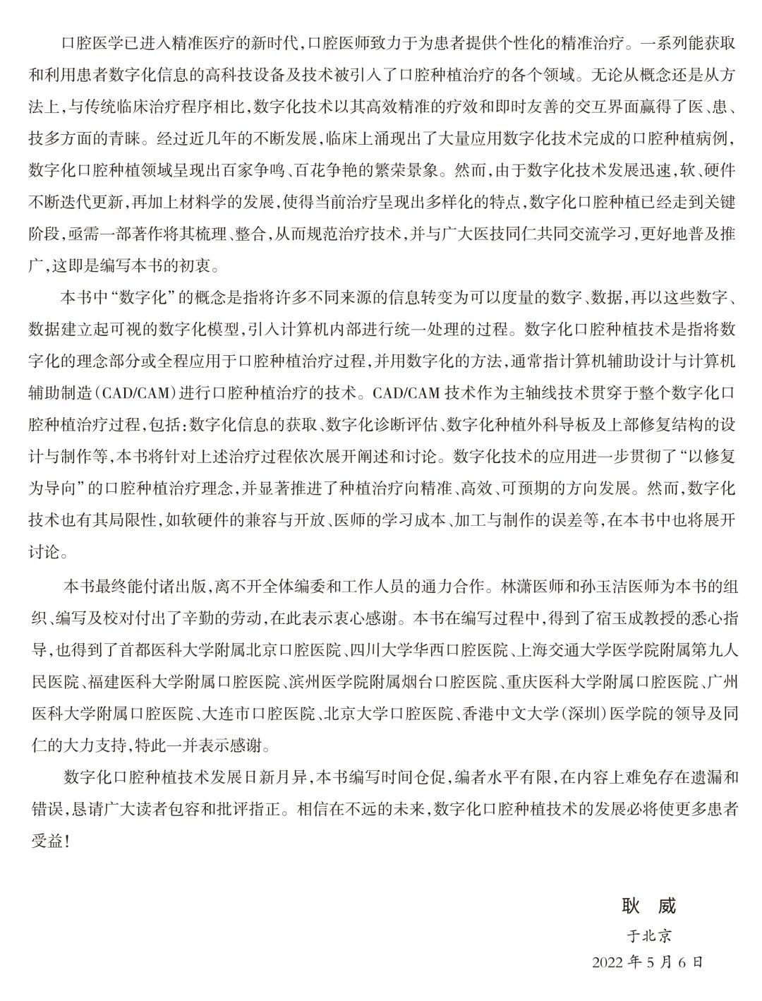 2. 全书共12章、近90万字,包括美学区种植、无牙颌种植和动态导航等热点内容,涵盖数字化诊断与设计程序、数字化外科程序、数字化修复程序和数字化技工工艺程序等治疗程序,以及技工端数据的处理、修复体的加工等步骤。