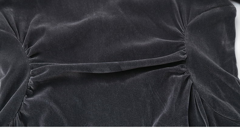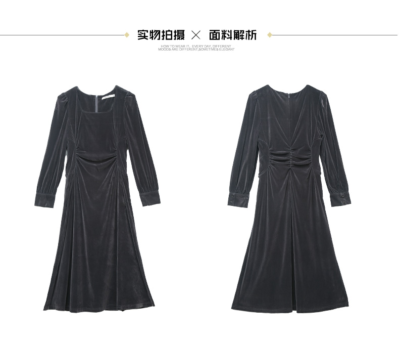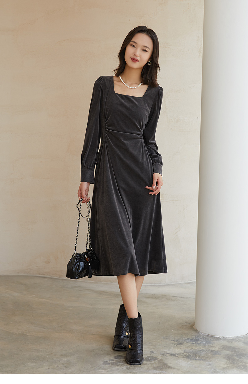 复古优雅方领褶皱收腰丝绒长裙 秋冬高级感长袖显瘦中长款连衣裙