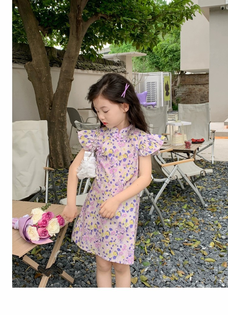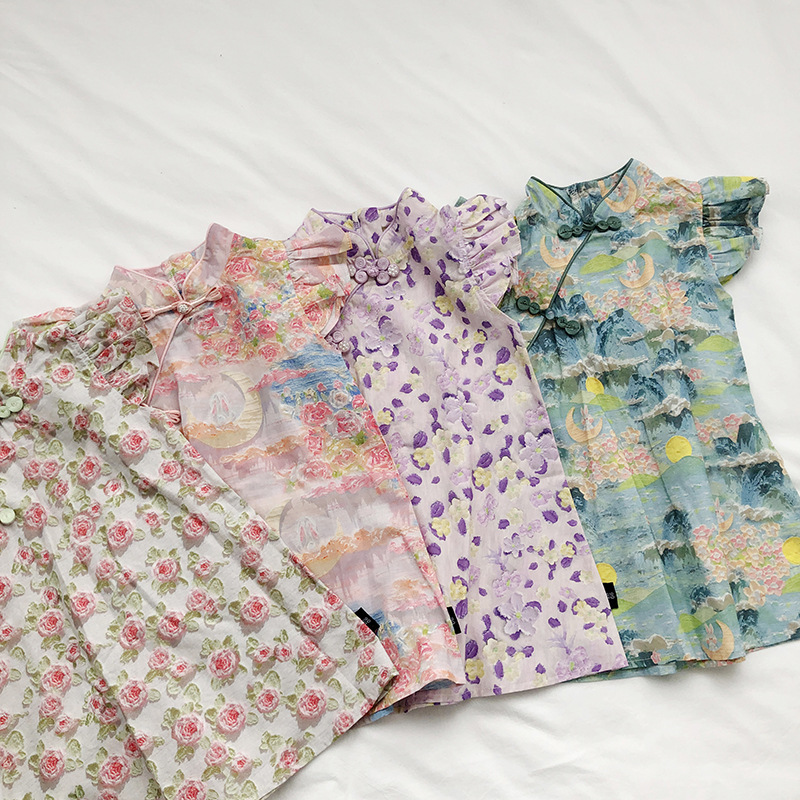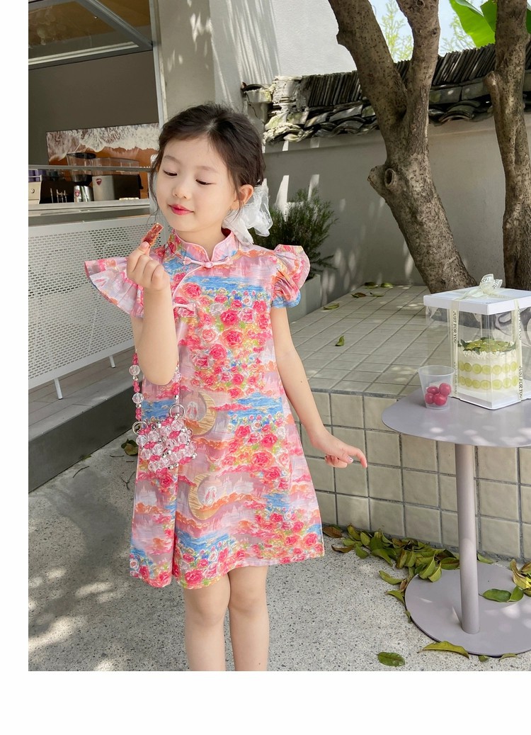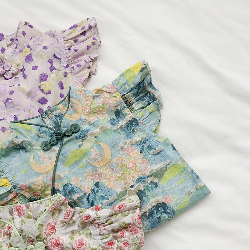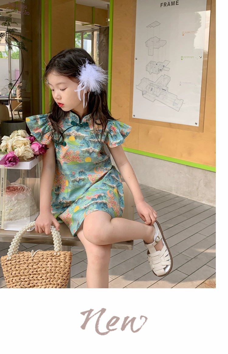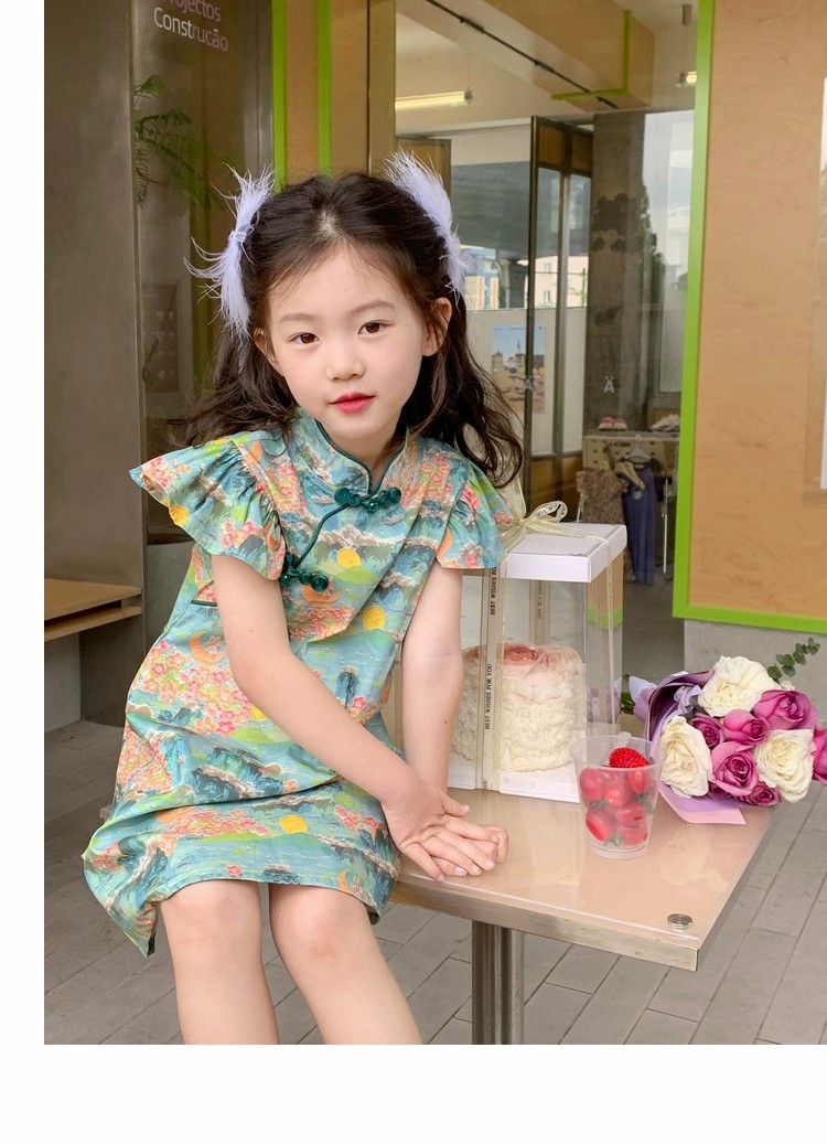 【童装儿童旗袍2023夏季新款】女童中国风纯棉印花飞袖连衣裙,舒适透气不变形起球,时尚复古好穿搭,复古经典小清新风-SH