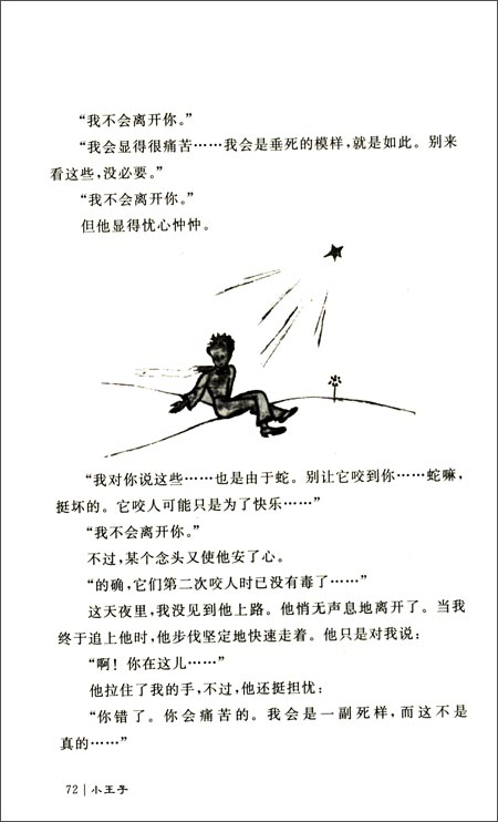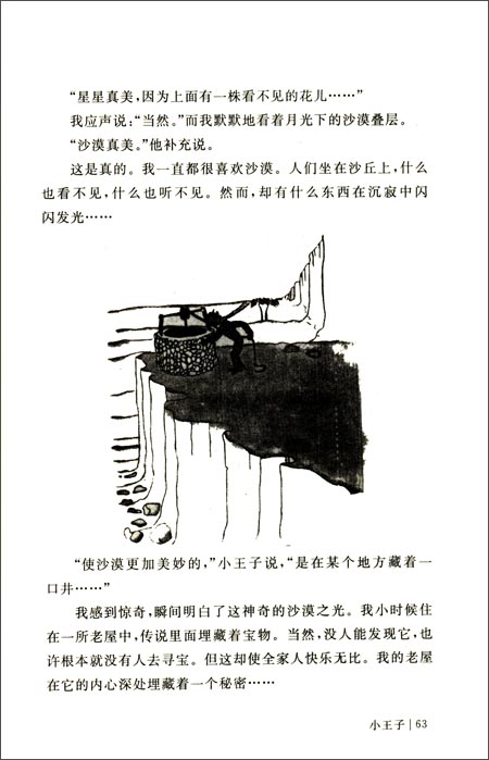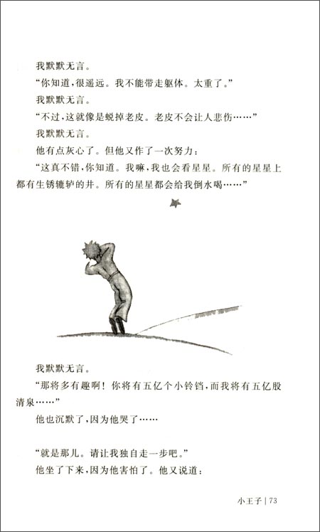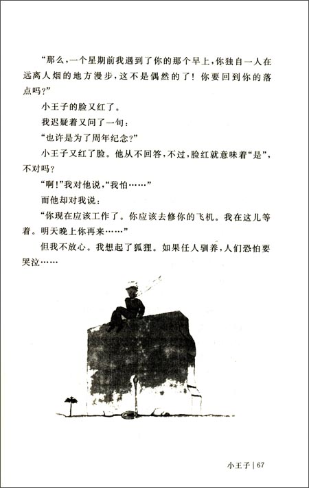 《小王子》极为坦率地阐述了一种道德体验。在这本书中,圣爱克絮佩里证实了自己的理论:只有孩子才能弄懂生活中朴实的真理,而他们能够理解的关键在于他们天真无邪。那个来自外星球的小家伙是个极为聪明的人,是个善解人意的人,是个负责任的人,他每天将自己的星球安排得井井有条:给他的玫瑰花浇水,拔掉多余的猴面包树苗,清理他的活火山和死火山。他要对他的“玫瑰”负责,对星球负责。他还告诉我们,判断一个人,应该根据其“行动”,而不是其“言语”。他告诉我们,凡事要用心,因为“只有用心去看才能看得明白。本质是肉眼看不见的”。
