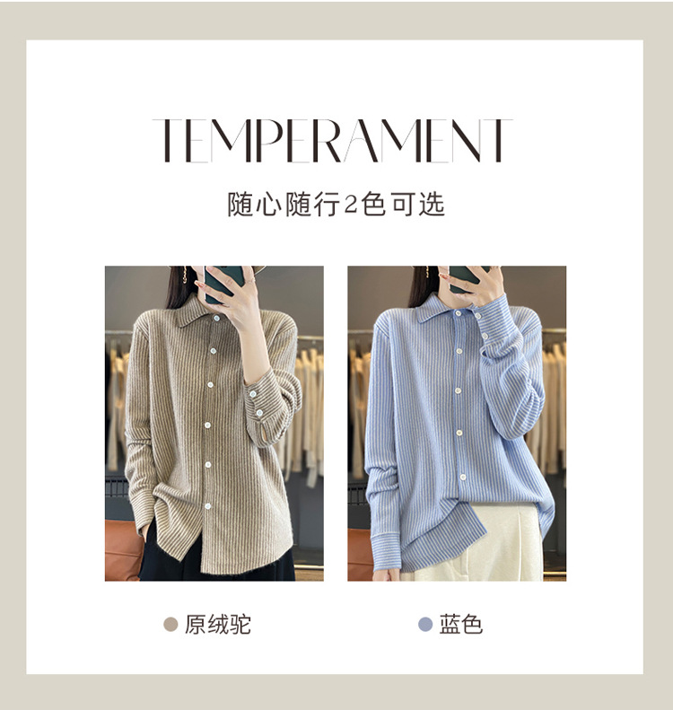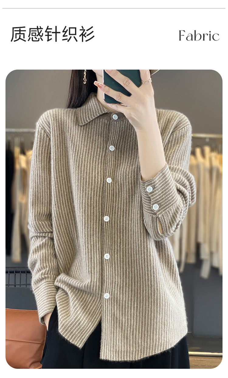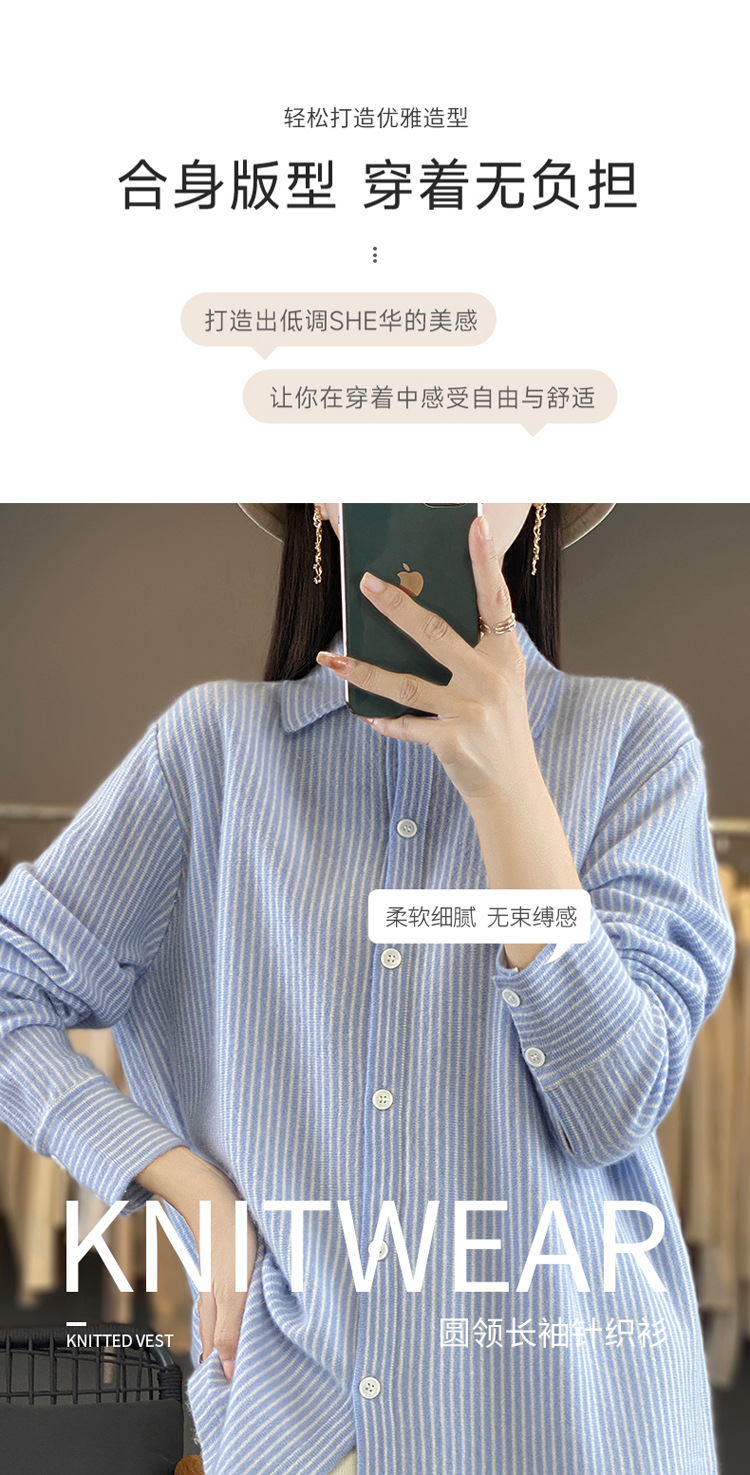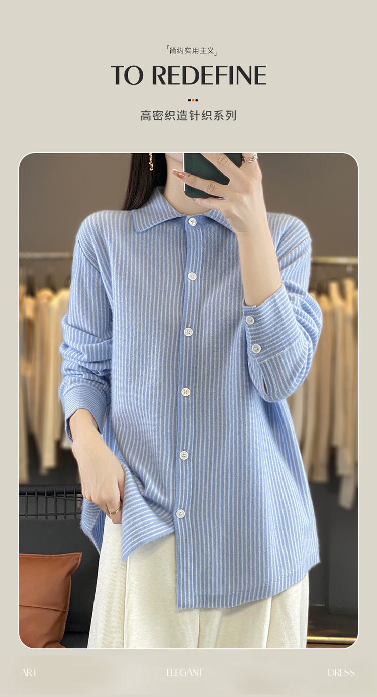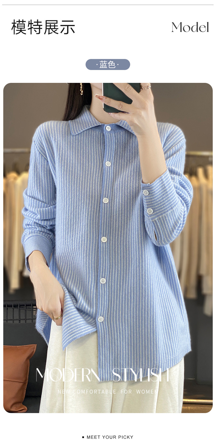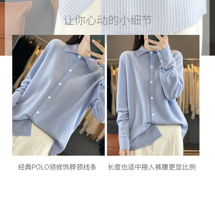雀说新款羊毛开衫女polo领韩版宽松条纹衬衫显瘦气质打底针织衫AL