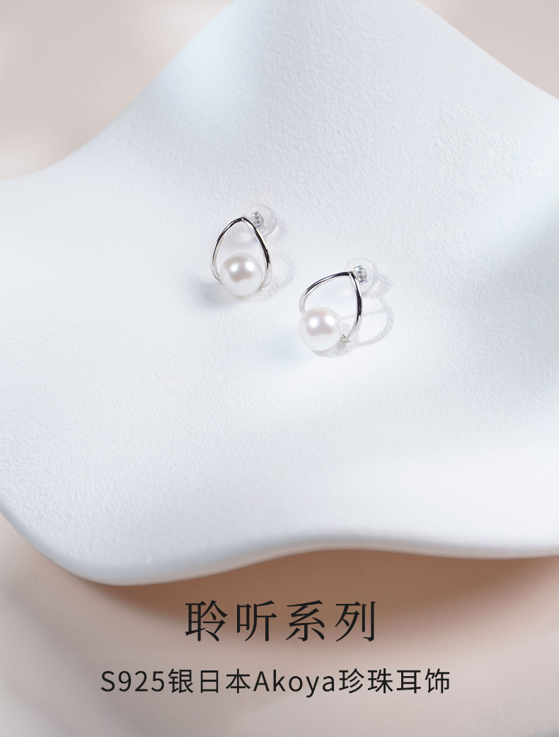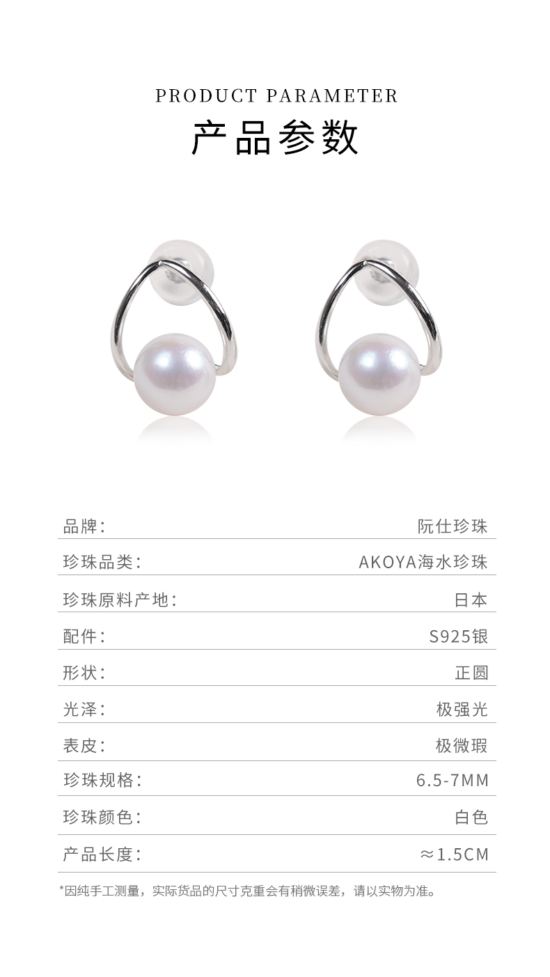 阮仕珍珠 聆听系列S925银日本珠AKOYA珍珠耳饰 6.5-7mm 正圆 极微瑕 极强光