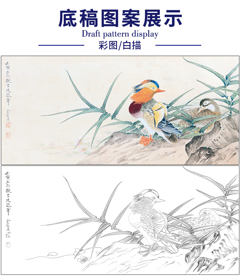 俞致贞花鸟工笔画白描底稿《鸳鸯》临摹勾线高清打印稿ZZ09