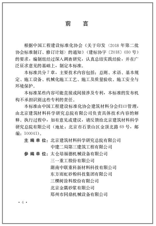 根据中国工程建设标准化协会《关于印发<2018年第二批协会标准制订、修订计划>的通知》(建标协字〔2018〕030号)的要求,编制组经过深入调查研究,认真总结实践经验,并在广泛征求意见的基础上,制定本标准。 本标准共分7章,主要技术内容包括:总则、术语、基本规定、施工设备、机械化施工工艺、施工及质量验收、施工安全与环境保护。 本标准由中国工程建设标准化协会建筑材料分会归口管理,由北京建筑材料科学研究总院有限公司负责具体技术内容的解释。