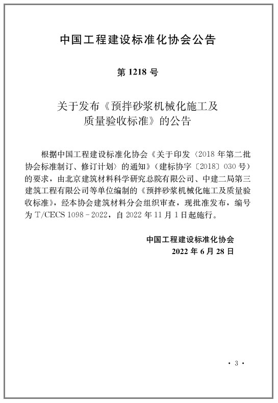 书名:预拌砂浆机械化施工及质量验收标准T/CECS 1098-2022