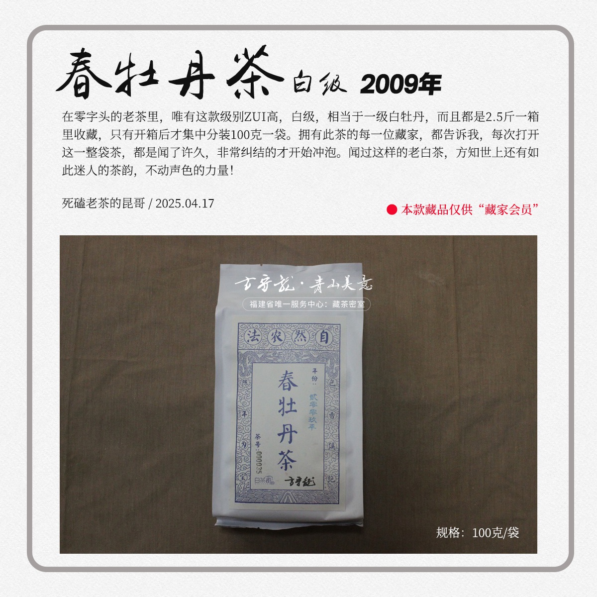 - 2021年,嘉木会创办了“藏茶密室”,开启了全新的藏茶模式,秉持“不将就,不迎合”的理念,通过“选、藏、养、醒”的方式,再度诠释藏茶的深意,沉醉杯汤,苦乐自知,茗透于心,迷之不悔!