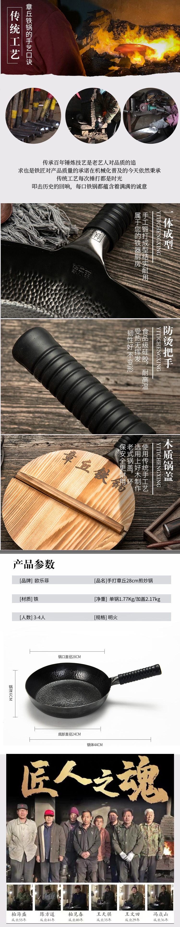 【官方正品保证】 欧乐菲(OLOFE)老关东章丘铁锅 加深黑煎锅手打平底锅老式物理不粘锅煎锅无涂层通用型28cm-OLOZQ-28D