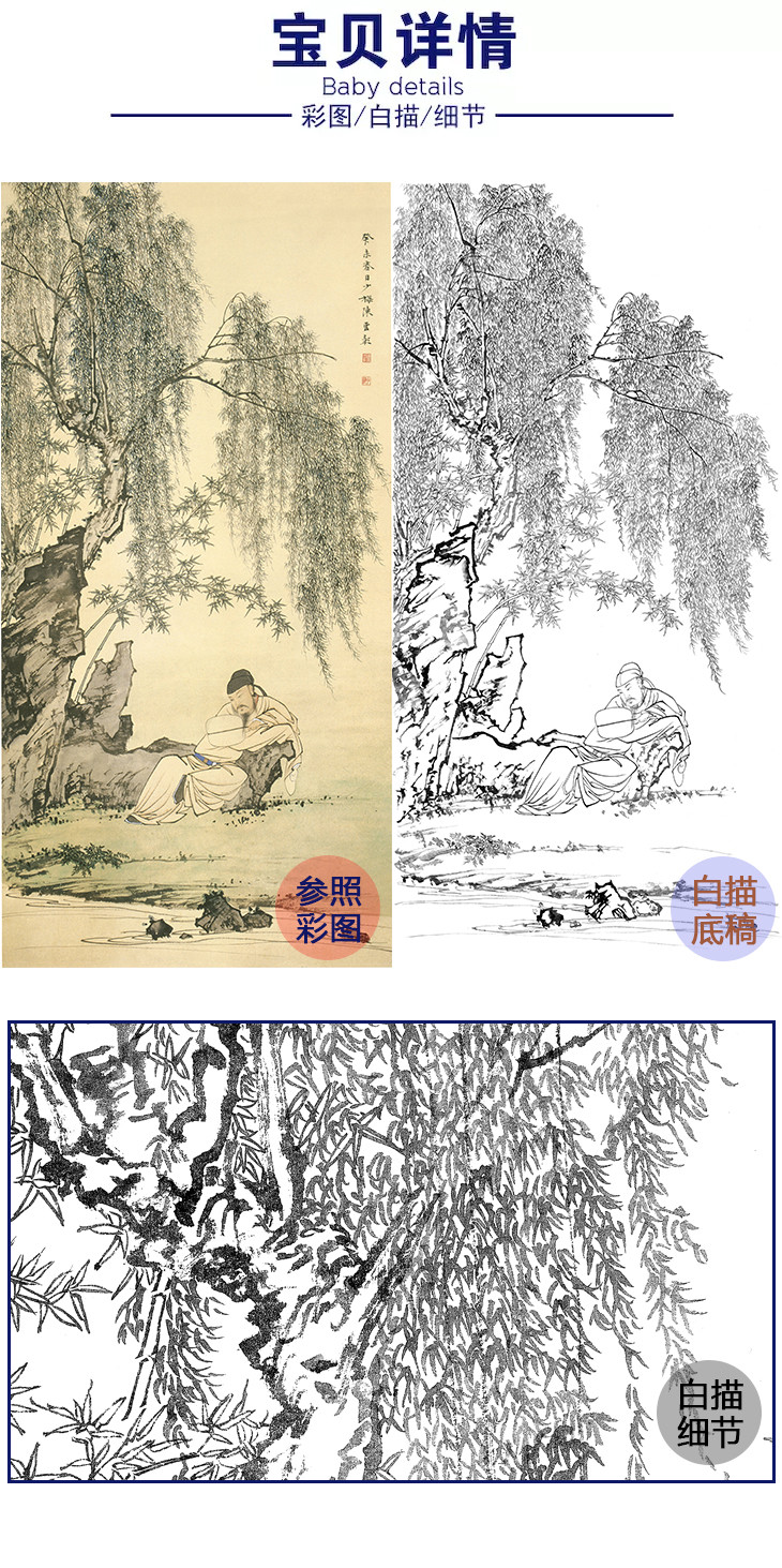 陈少梅竖幅工笔山水人物白描底稿-《柳荫觅句》-多种白描尺寸可选-CR25