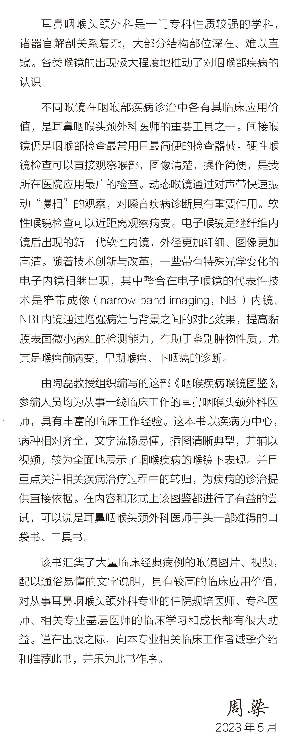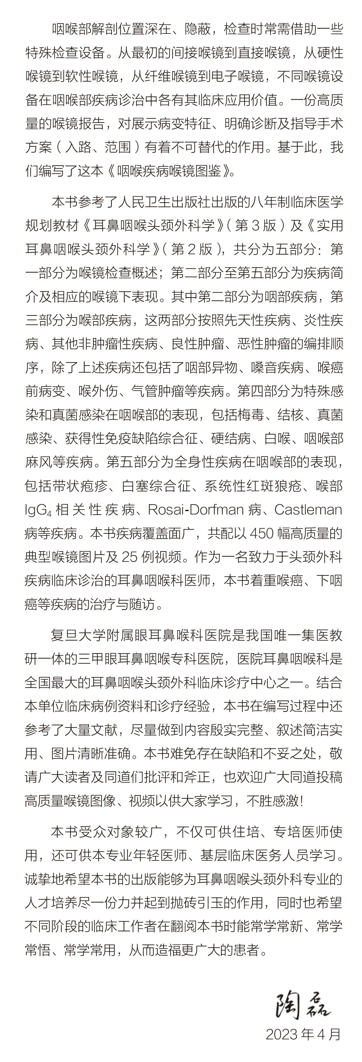 本书主体分为两部分:第一部分是喉镜检查概述,系统介绍了喉镜分类、临床应用价值、标准检查方法及设备消毒与养护等;第二部分为全书主体和重点,以图说的形式全面介绍了近70种咽喉科疾病的喉镜下表现,手册中涵盖的病种全面,涵盖了咽喉科的全部疾病。同时在硬性喉镜图片基础上,对于肿瘤性疾病针对性配以NBI内镜图,嗓音功能性疾病针对性配以频闪喉镜视频。本书力求以形式达到喉镜检查“一册在手,诊断无忧”的目的,为广大耳鼻喉科住院医师、低年资医师、规培生及研究生提供一便携、简洁明了的咽喉疾病的喉镜诊断“口袋书”。