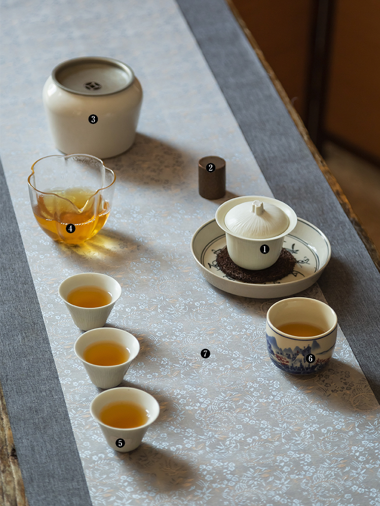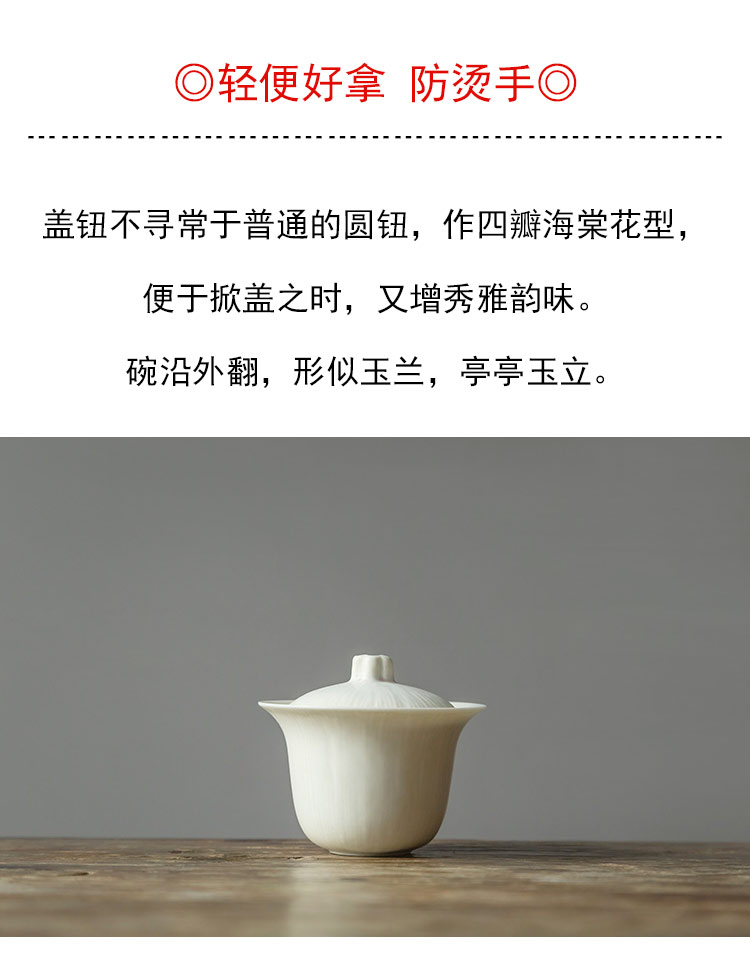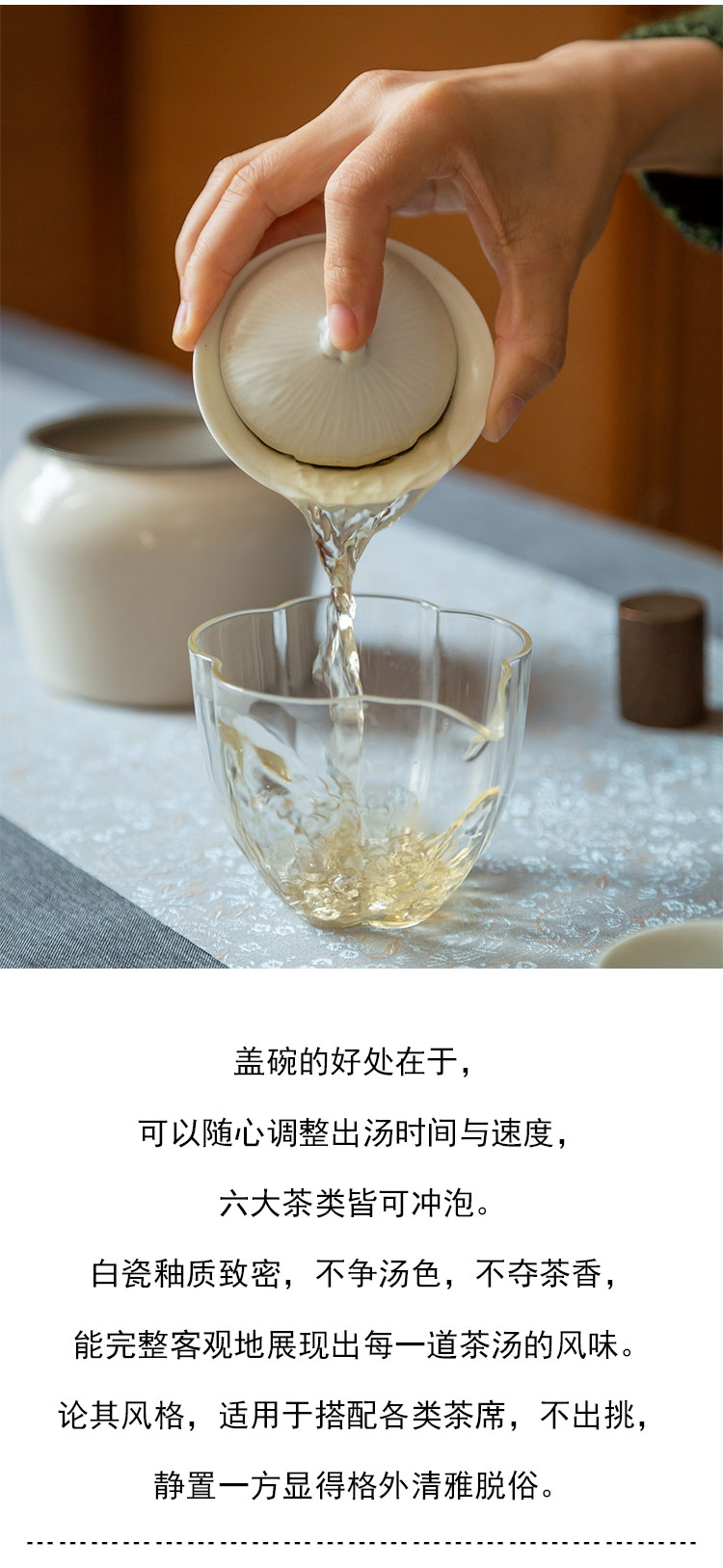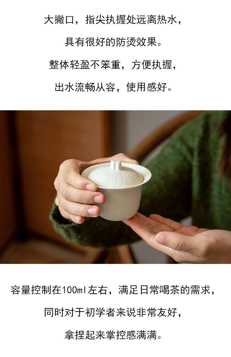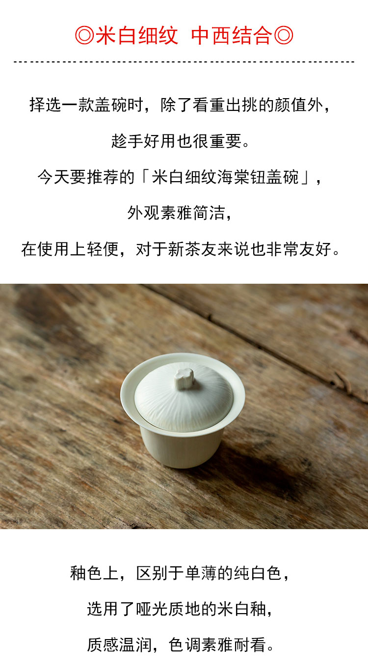 茶香记 景德镇 米白细纹 海棠钮盖碗 哑光质地 素雅简洁 持握轻巧