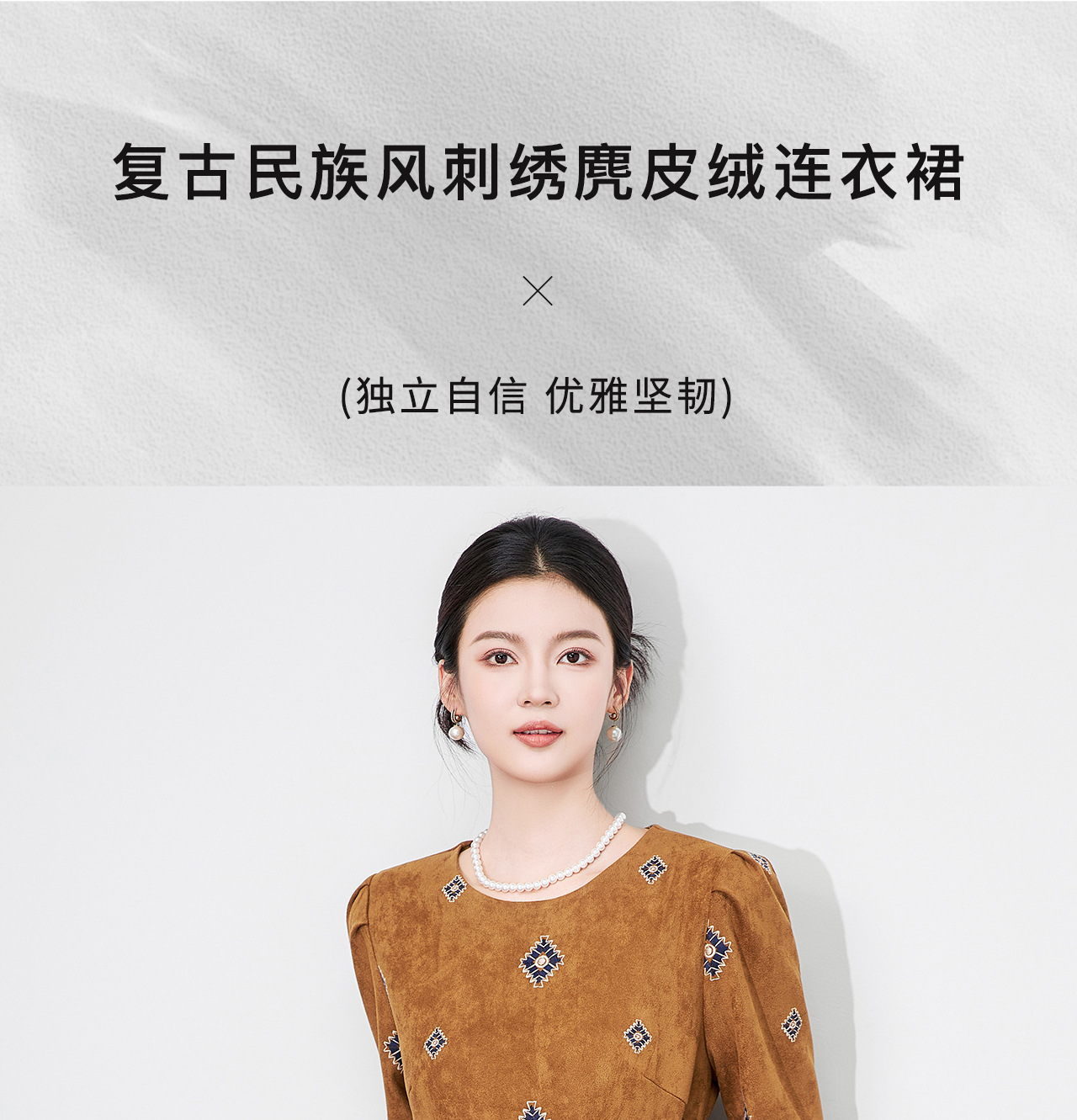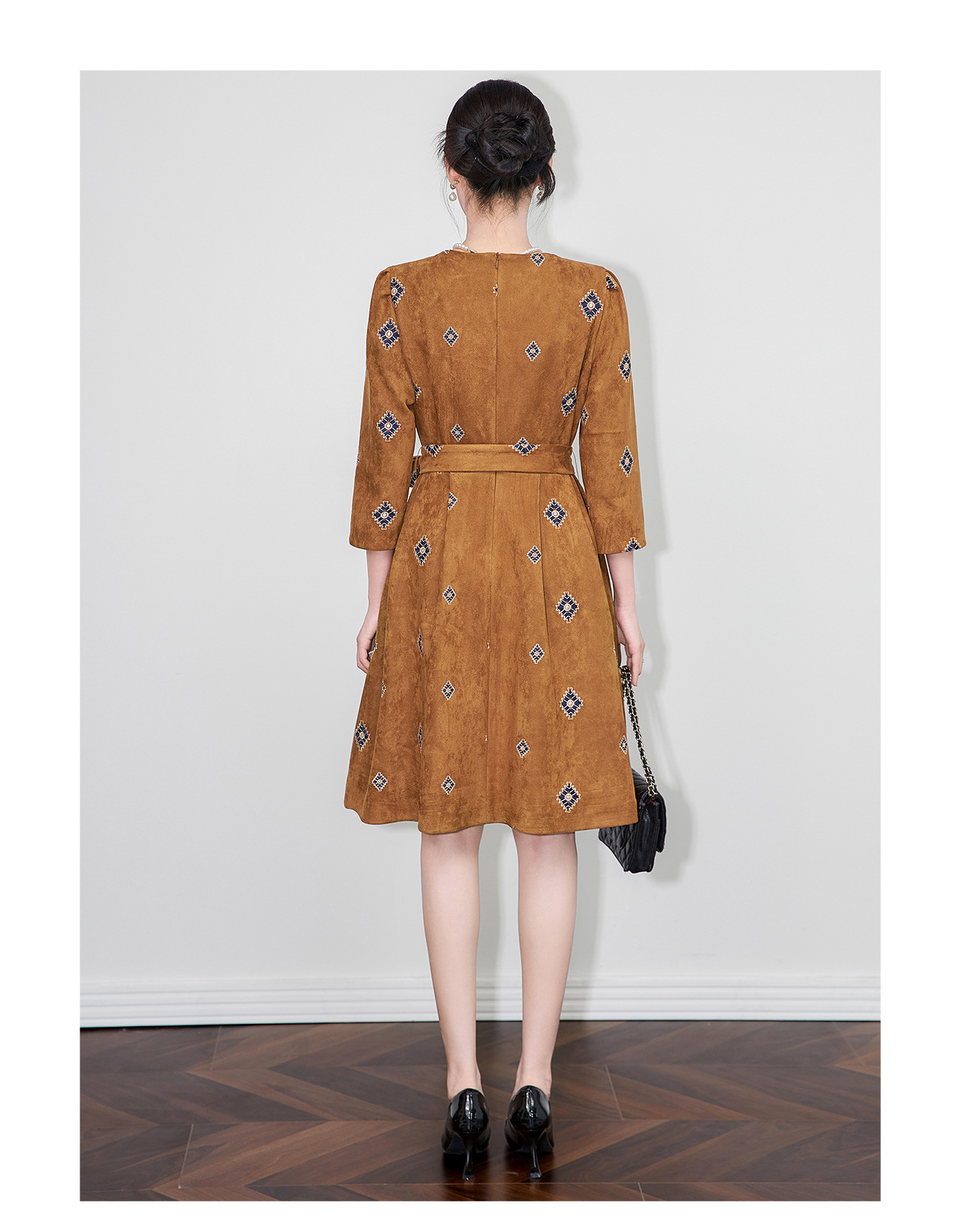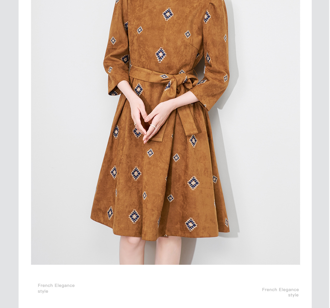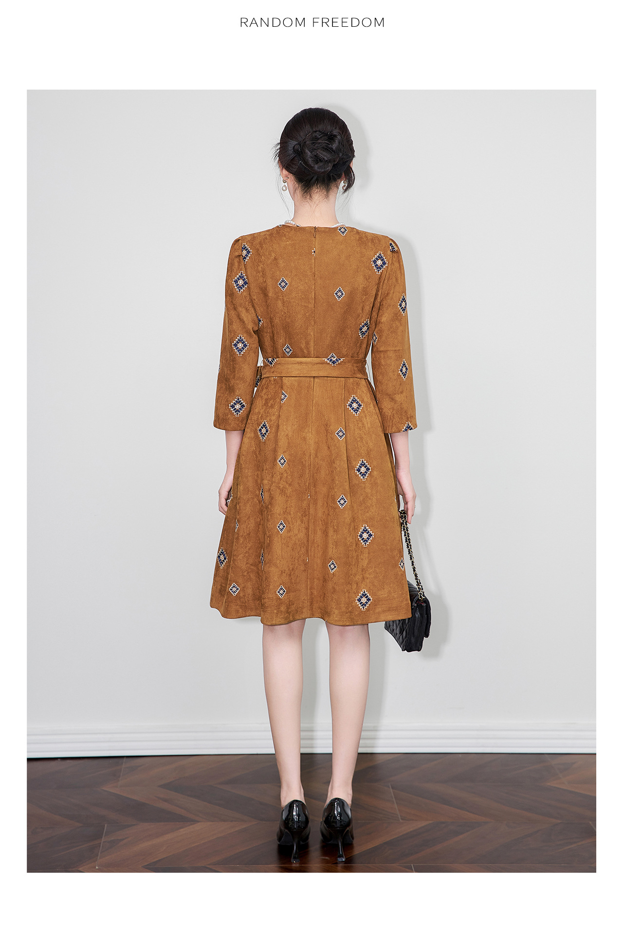 「高货wl」全新升级【铂金会员339/天猫459/差价120】(12828)洛诗琳轻奢重工刺绣连衣裙2025秋冬麂皮绒复古收腰大摆裙
