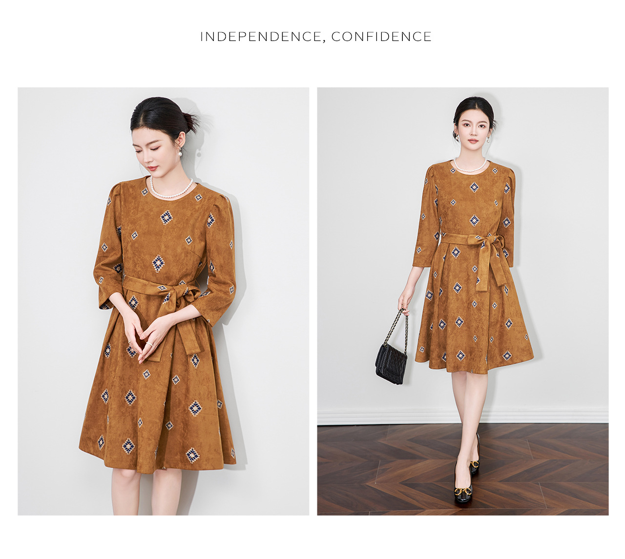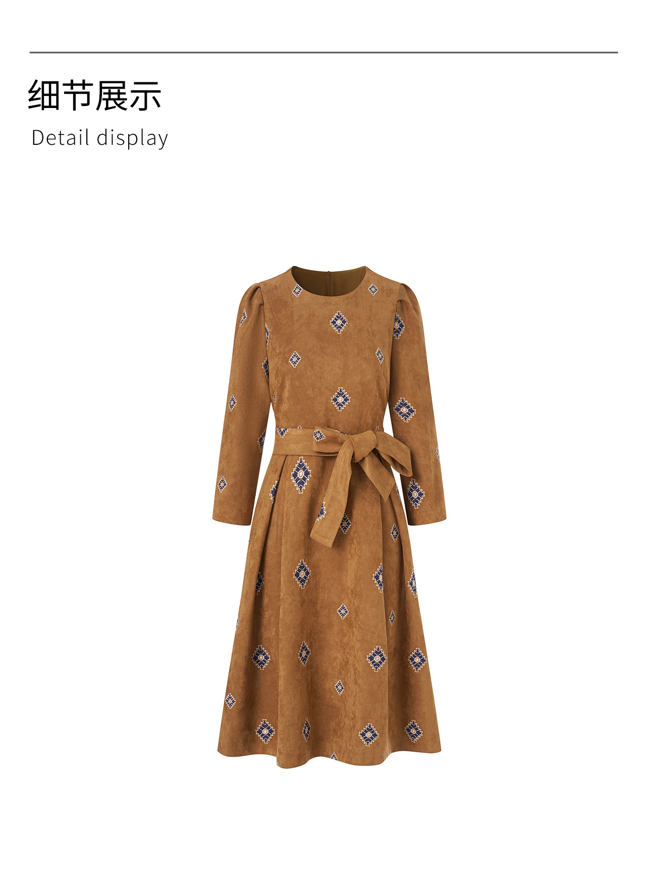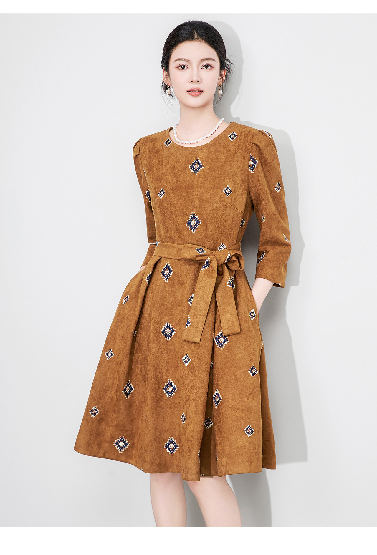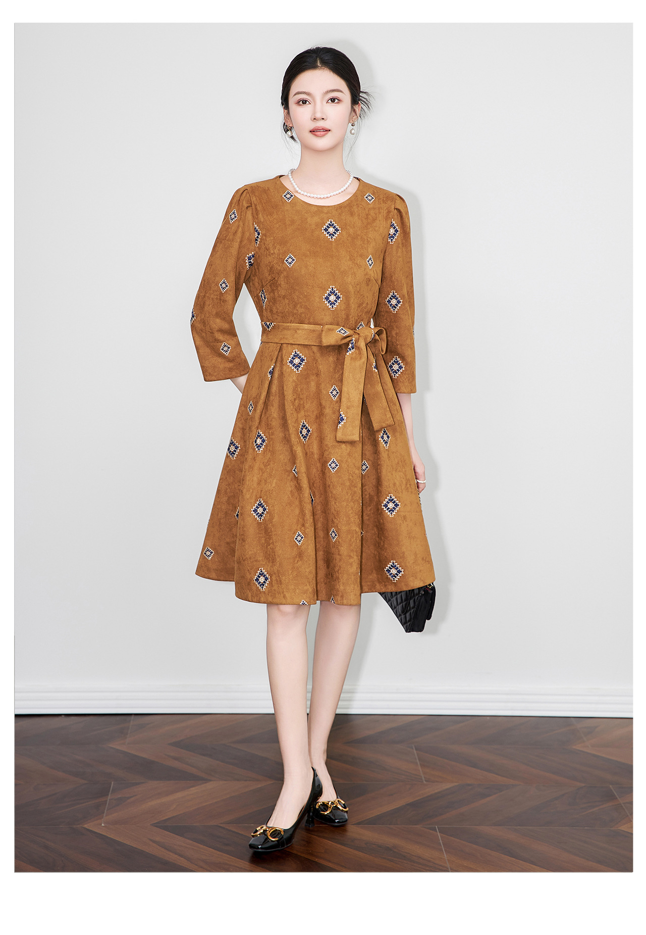 「高货wl」全新升级【铂金会员339/天猫459/差价120】(12828)洛诗琳轻奢重工刺绣连衣裙2025秋冬麂皮绒复古收腰大摆裙