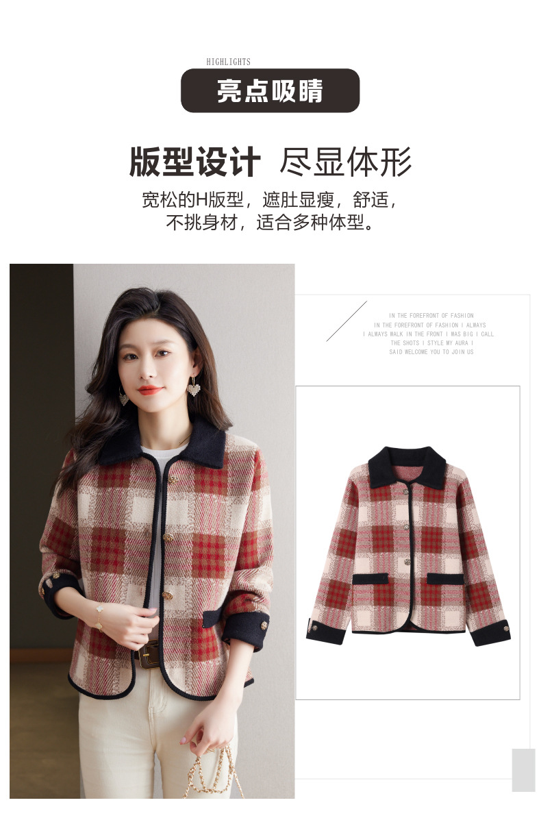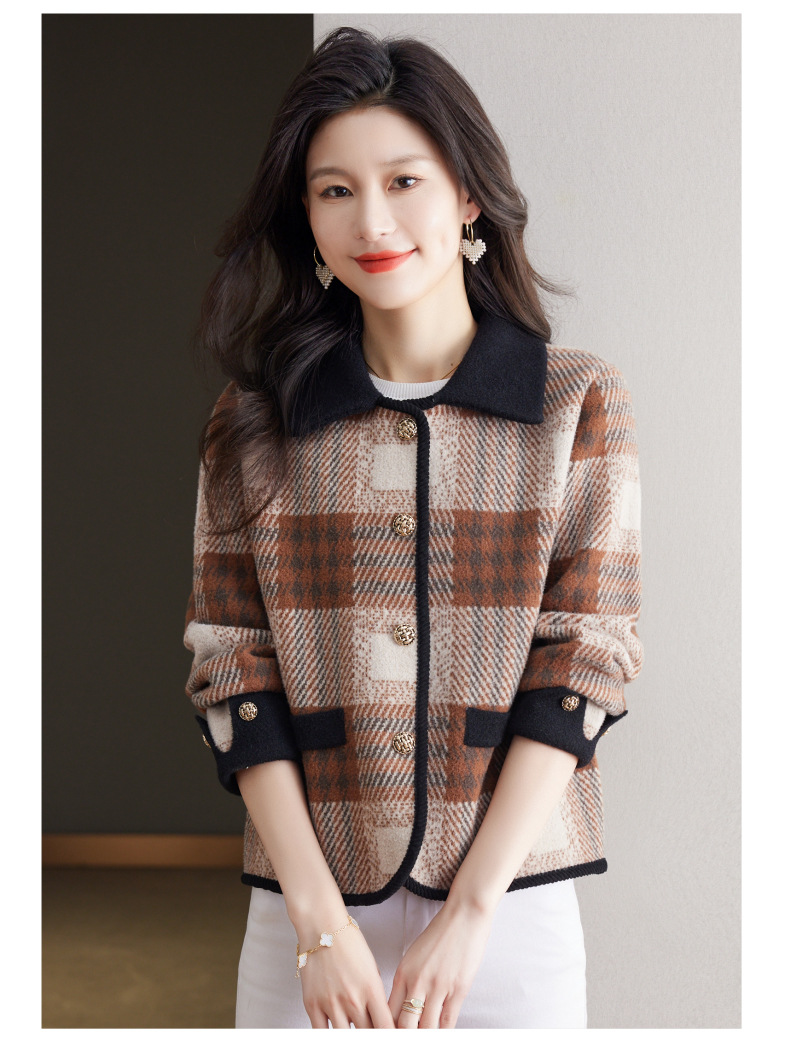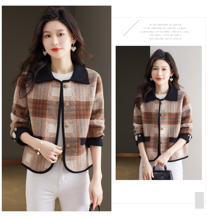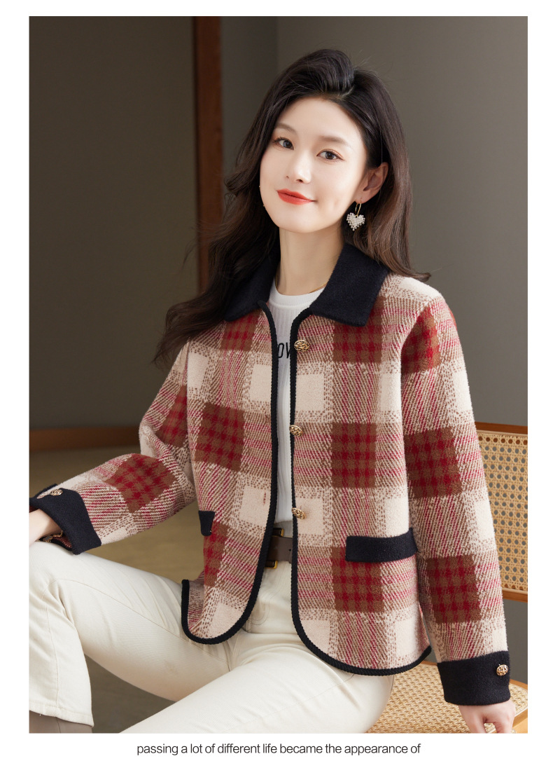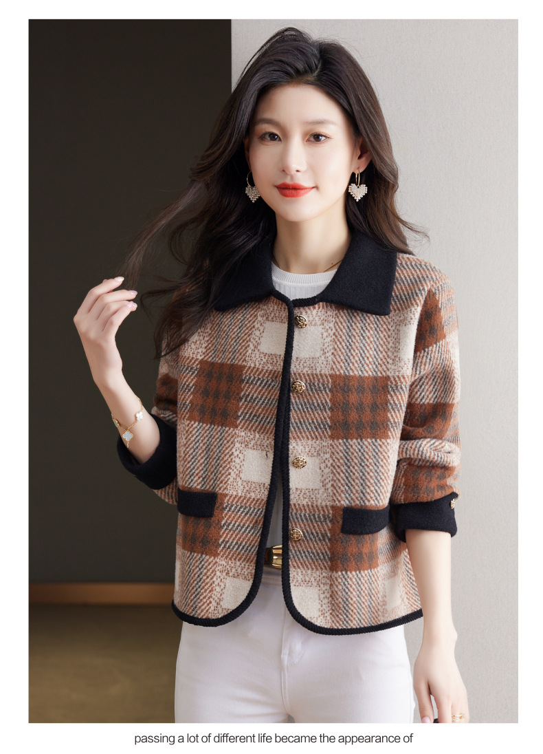 CC17-1929春秋小个子短外套女2024新款洋气翻领小香风针织开衫格子宽松上衣