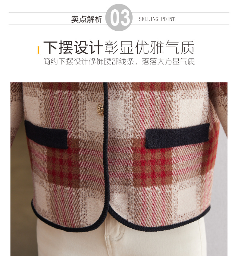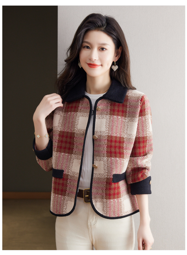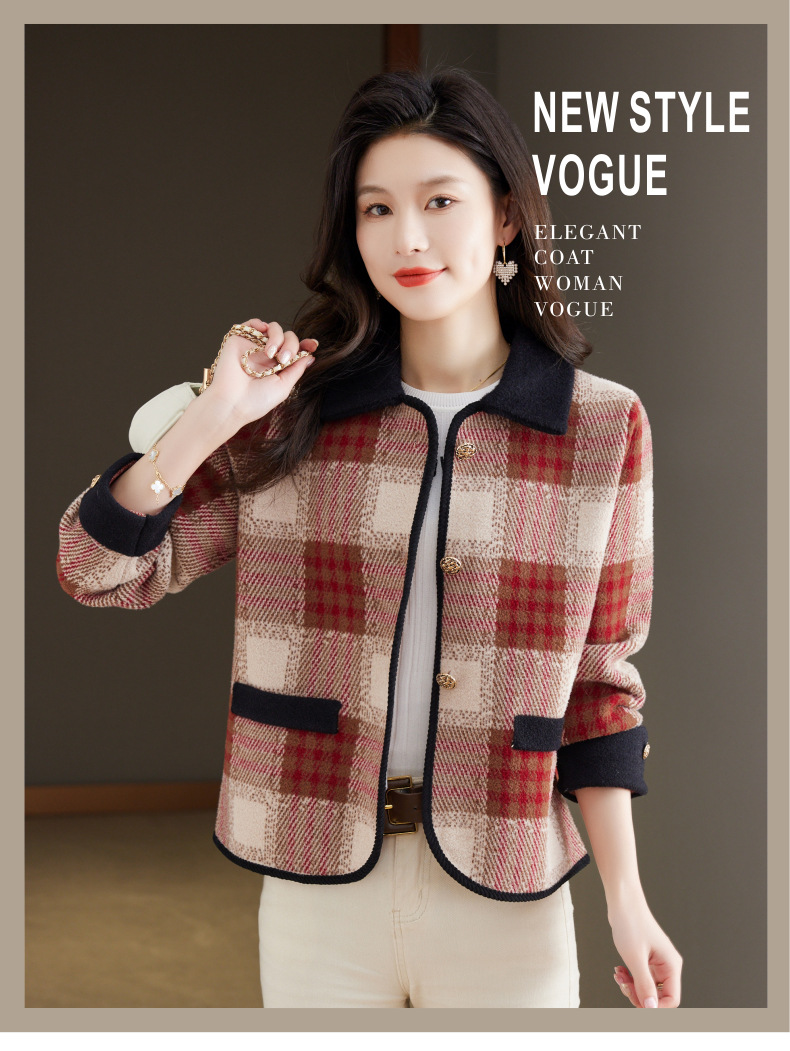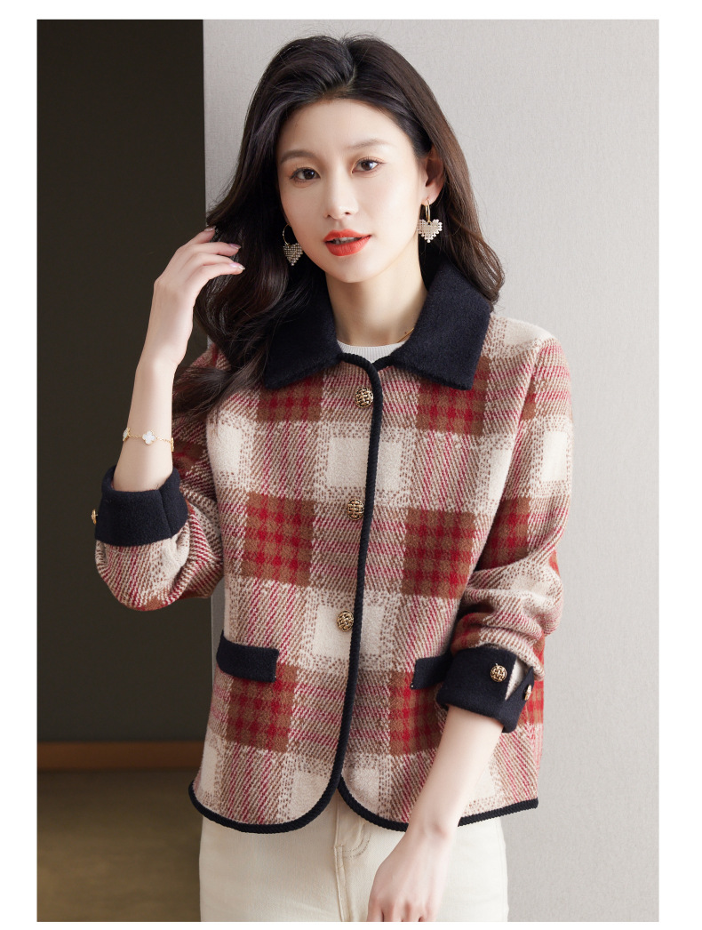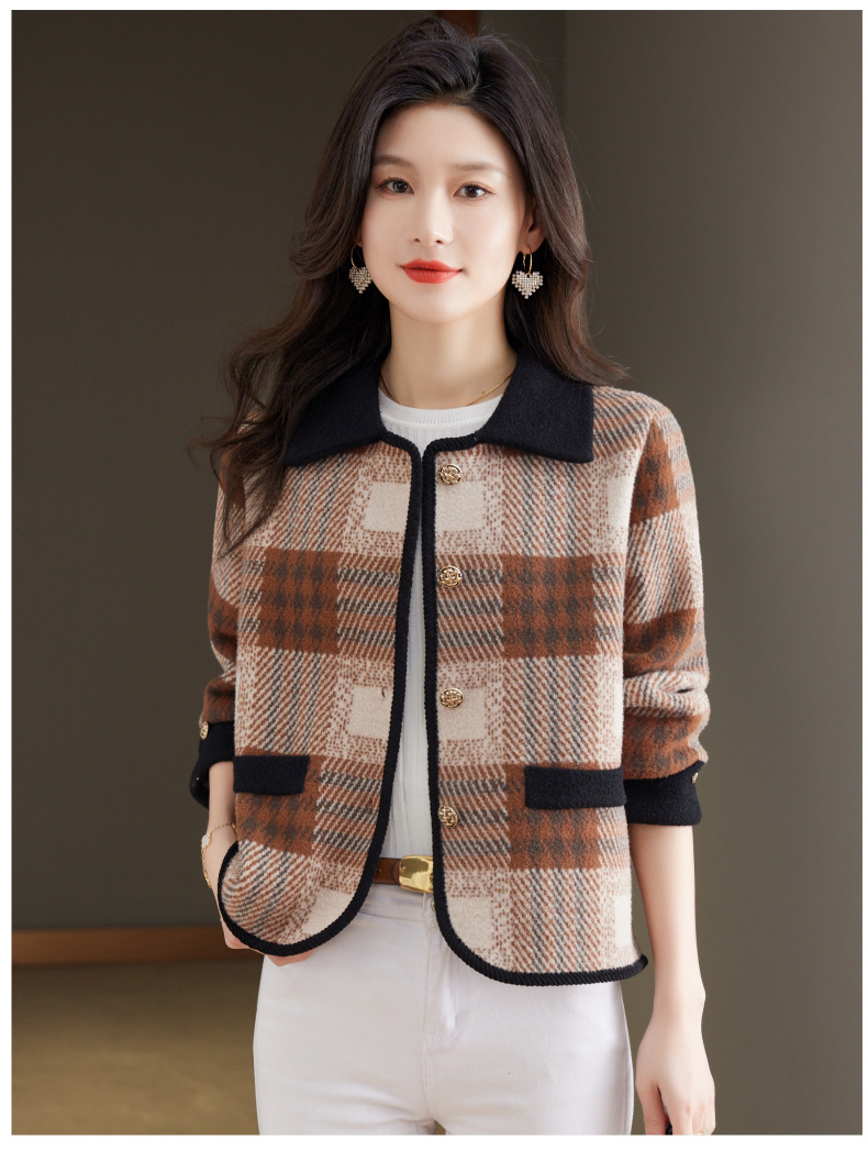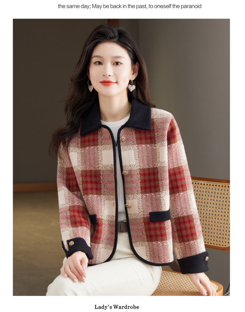 CC17-1929春秋小个子短外套女2024新款洋气翻领小香风针织开衫格子宽松上衣