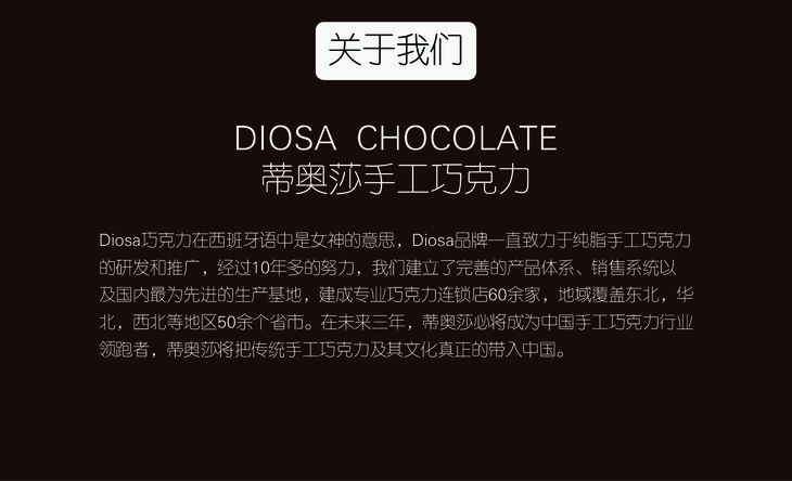 - DIOSA(蒂奥莎)巧克力在西班牙语中是“女神”的意思。DIOSA品牌一直致力于纯脂手工巧克力的研发和推广,全部原料来自比利时,意大利,西班牙等欧洲传统巧克力王国,运用比利时传统工艺纯手工制作。