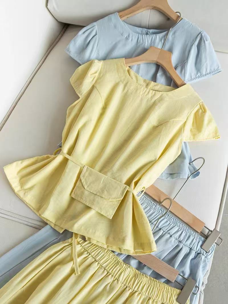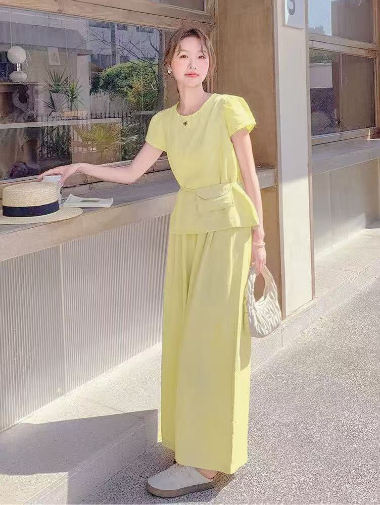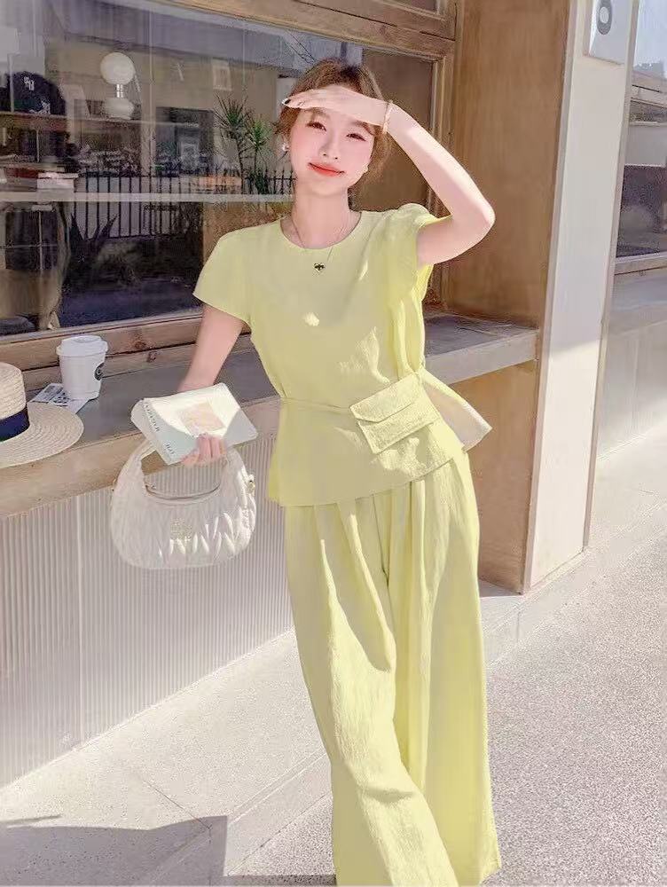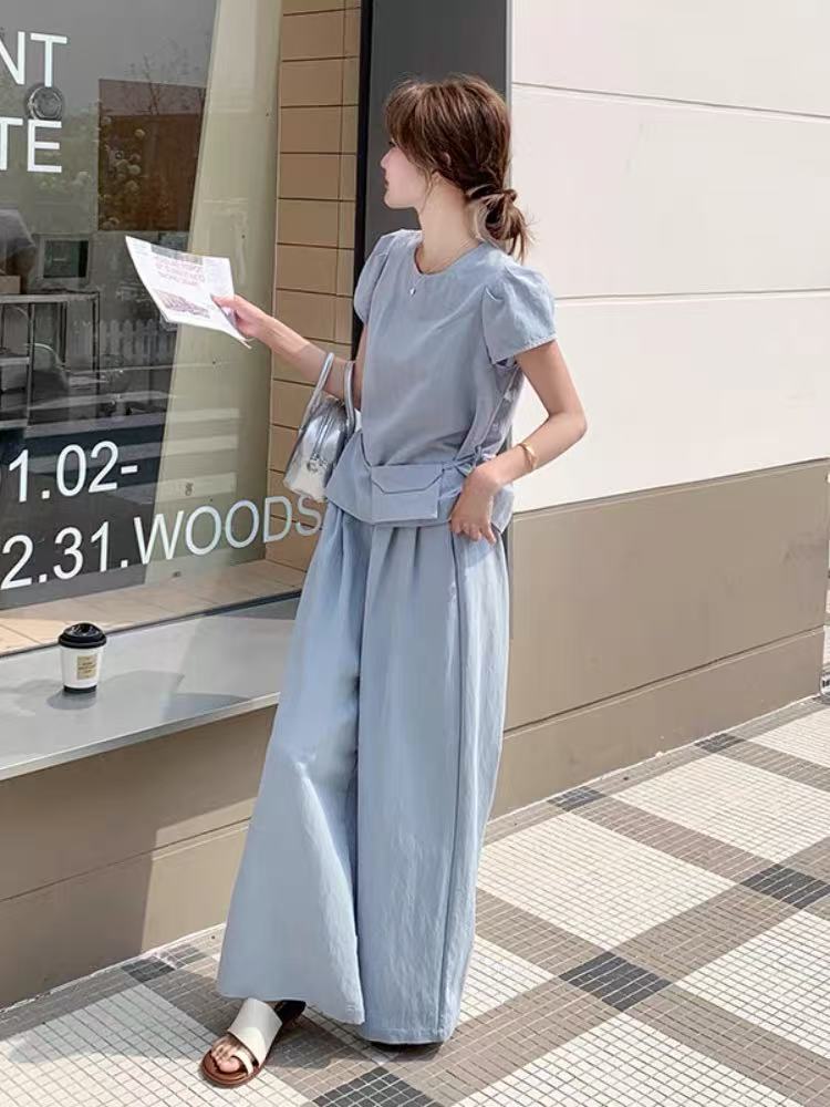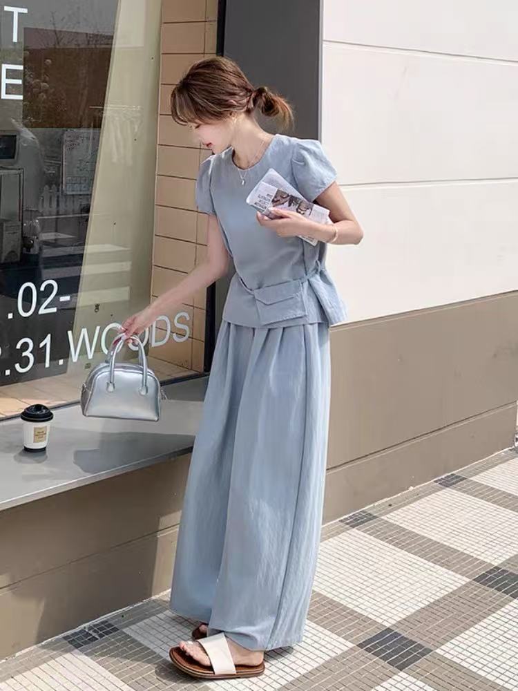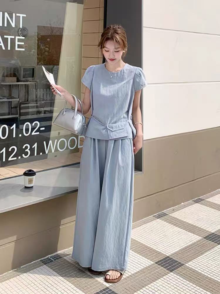 套装【韩系2025】855(赠送小腰包)休闲后系扣上衣➕阔腿裤两件套-喜出