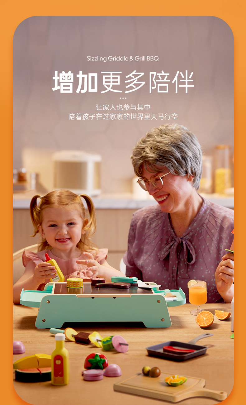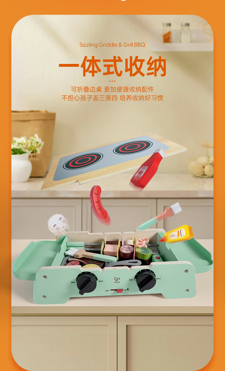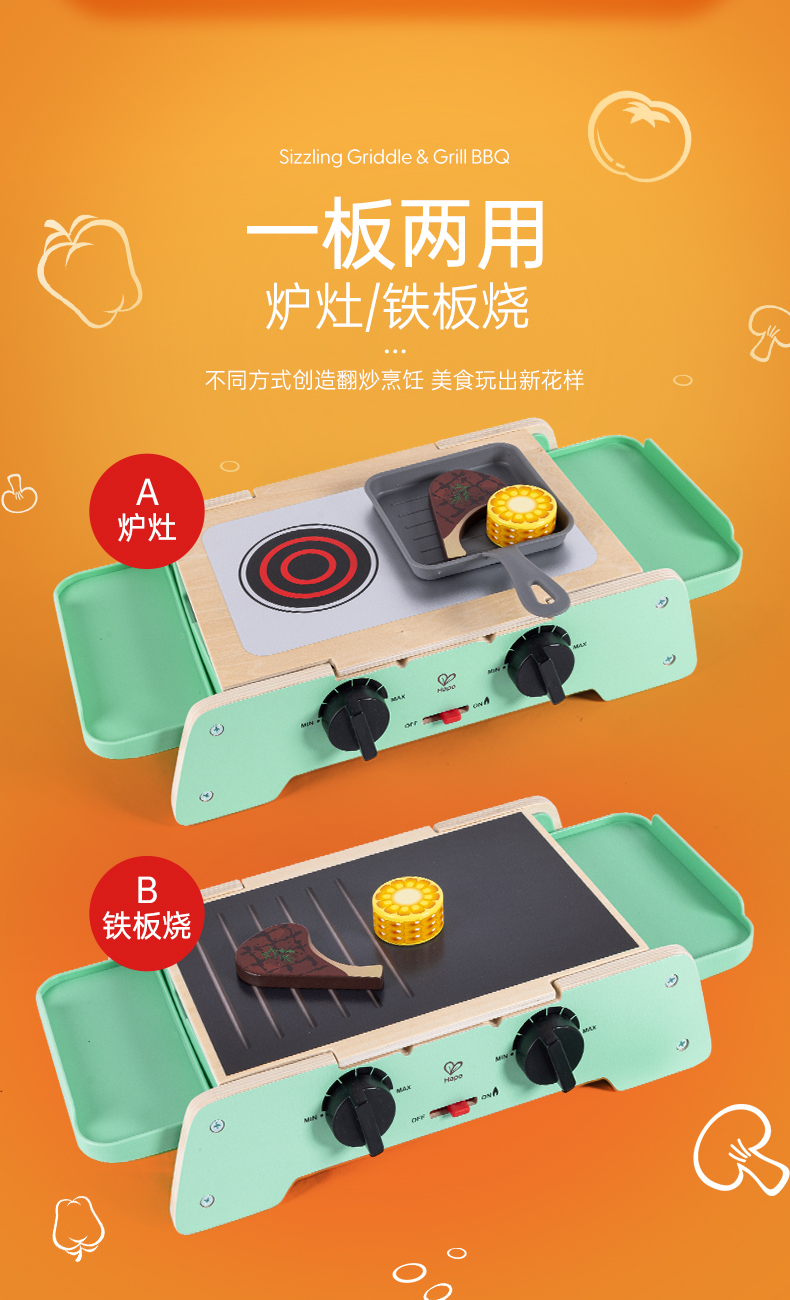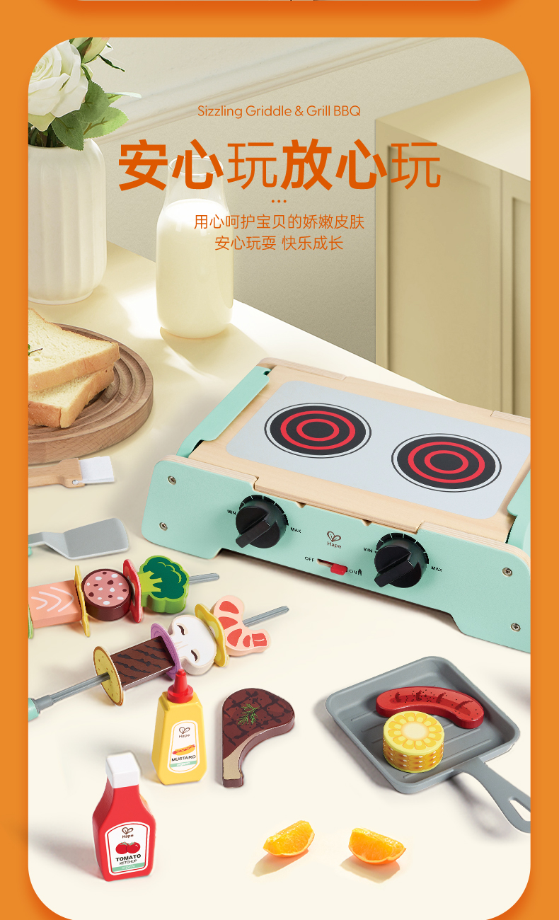 Hape儿童过家家 厨房烧烤玩具仿真烤串铁板食物做饭套装男女孩礼物 多功能仿真BBQ套装 E3214