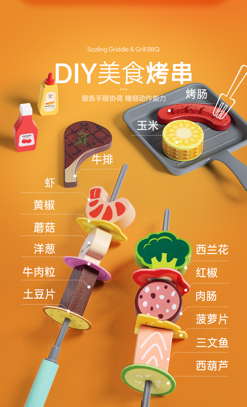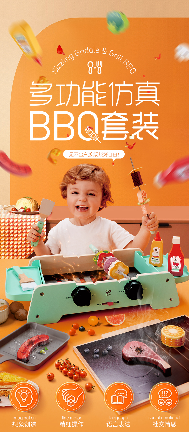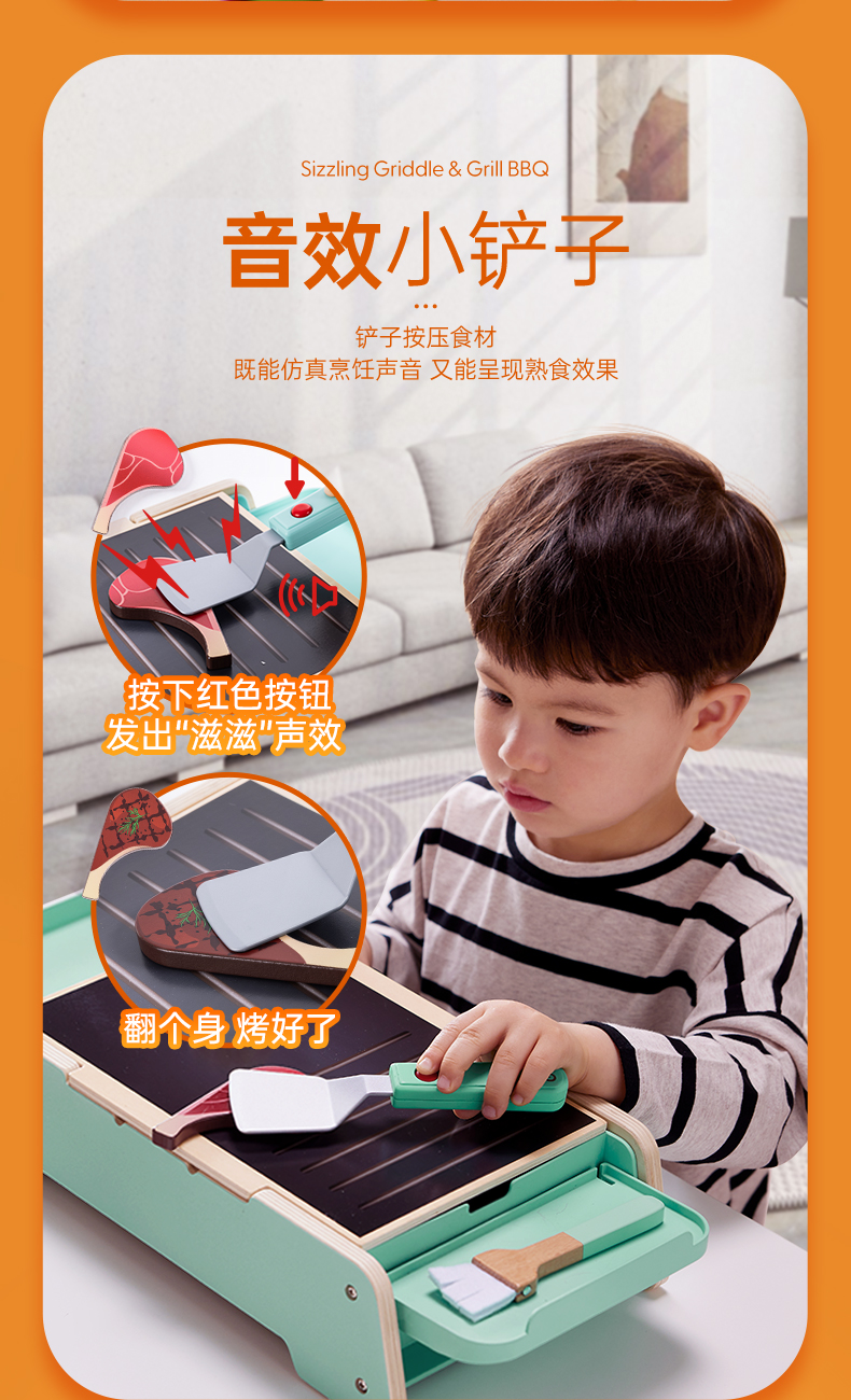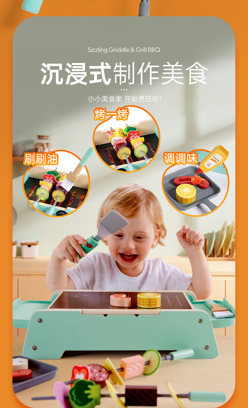 Hape儿童过家家 厨房烧烤玩具仿真烤串铁板食物做饭套装男女孩礼物 多功能仿真BBQ套装 E3214